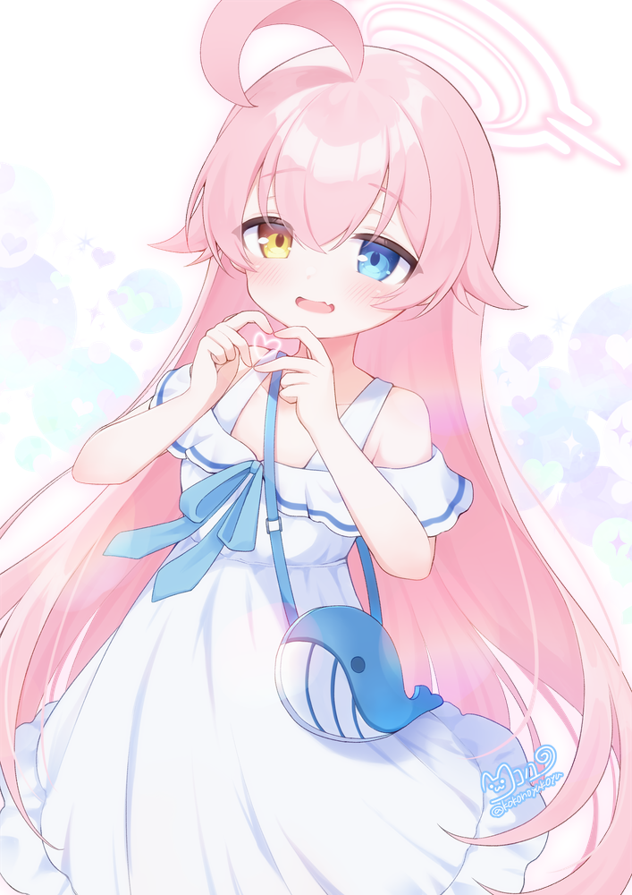 1girl ahoge bag blue_archive blue_eyes blush dress fang hair_between_eyes halo heart heart_hands heterochromia hoshino_(blue_archive) long_hair nanopai_kakumeikokonoyu official_alternate_costume open_mouth pink_hair pink_halo shoulder_bag signature skin_fang solo twitter_username white_dress yellow_eyes