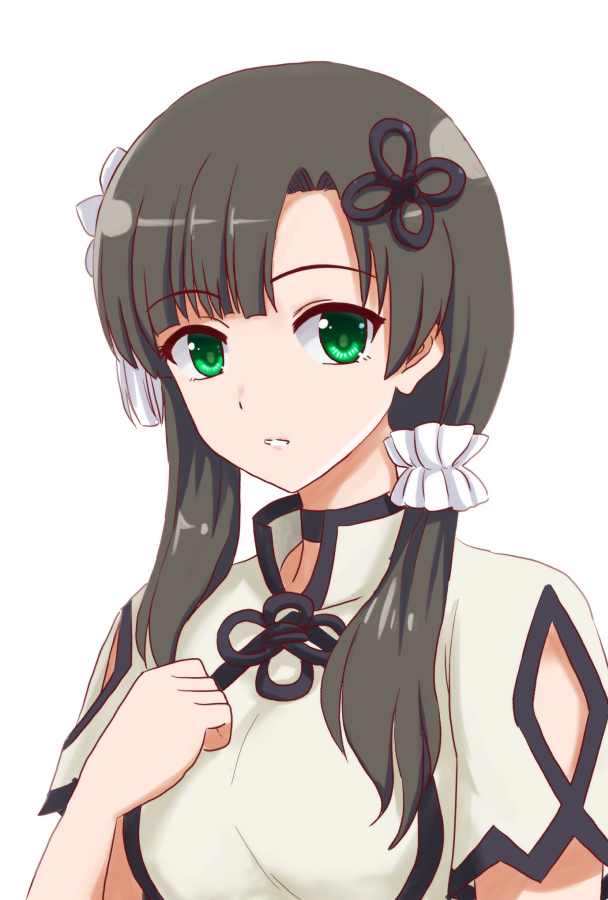 1girl akizuki_taiga arm_at_side arm_cutout assault_lily black_choker black_hair blunt_bangs choker clothing_cutout commentary_request flower flower_knot green_eyes hair_flower hair_ornament hair_over_shoulder hair_scrunchie hand_on_own_chest hand_up long_hair looking_at_viewer low_ponytail low_side_ponytail parted_lips ponytail scrunchie shirt short_sleeves side_ponytail simple_background solo tassel tassel_hair_ornament upper_body wang_yujia white_background white_flower white_scrunchie white_shirt