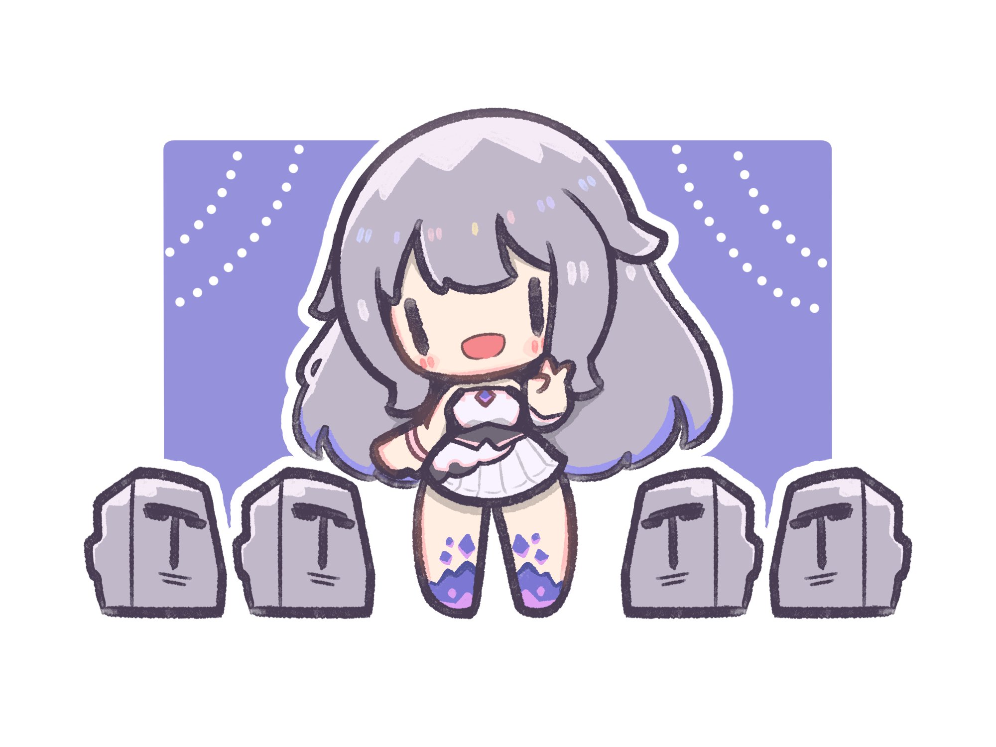 1girl blush bracelet chibi decrilus dress gem hair_flaps highres hololive hololive_english jewelry koseki_bijou koseki_bijou_(1st_costume) long_hair looking_at_viewer moai open_mouth purple_gem purple_hair sidelocks smile solo standing v virtual_youtuber white_dress |_|