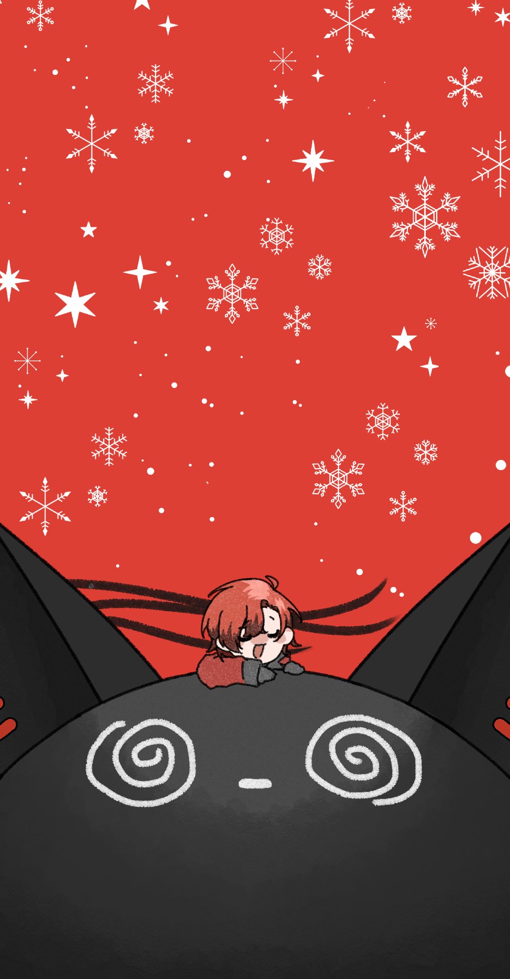 1boy @_@ alternate_size black_gloves closed_eyes creature gloves hair_between_eyes highres holostars holostars_english jacket long_sleeves looking_at_another machina_x_flayon machiroon_(machina_x_flayon) nynna_n on_animal open_mouth parted_bangs red_background red_hair red_jacket snowflakes snowing star_(symbol) virtual_youtuber winter