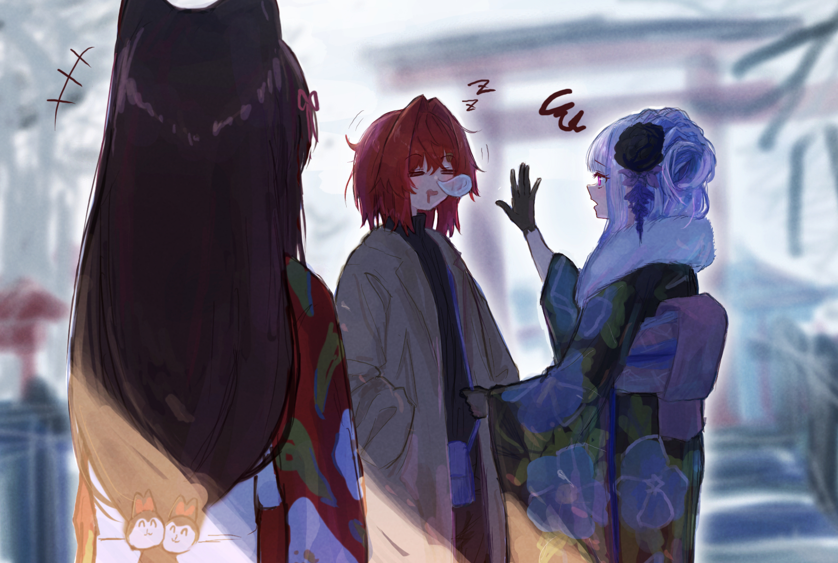+++ 3girls ange_katrina bag blue_hair brown_coat brown_hair coat drooling floral_print fur_collar gloves hair_intakes highres hitanu inui_toko inui_toko_(kimono) japanese_clothes kimono lize_helesta lize_helesta_(6th_costume) long_hair long_sleeves mouth_drool multiple_girls nijisanji nose_bubble print_kimono red_hair sanbaka_(nijisanji) shoulder_bag sleeping sleeping_upright squiggle standing torii virtual_youtuber white_hair zzz