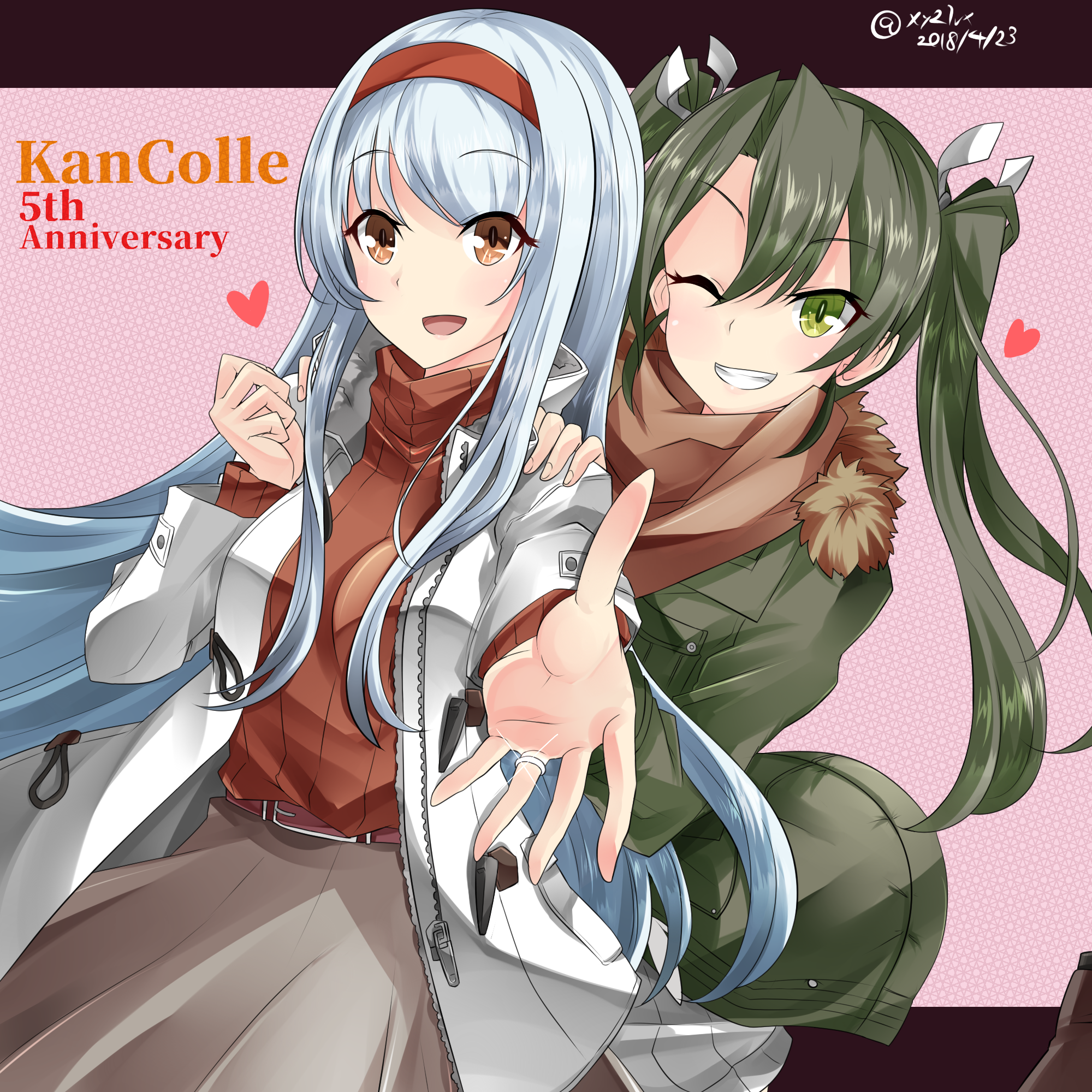 2girls :d ;d brown_eyes coat commentary_request english_text green_eyes grey_hair grin hair_ribbon hairband hands_on_another's_shoulders hebitsukai-san highres kantai_collection long_hair looking_at_viewer multiple_girls one_eye_closed open_mouth reaching revision ribbon shoukaku_(kancolle) smile twintails white_hair winter_clothes winter_coat zuikaku_(kancolle)