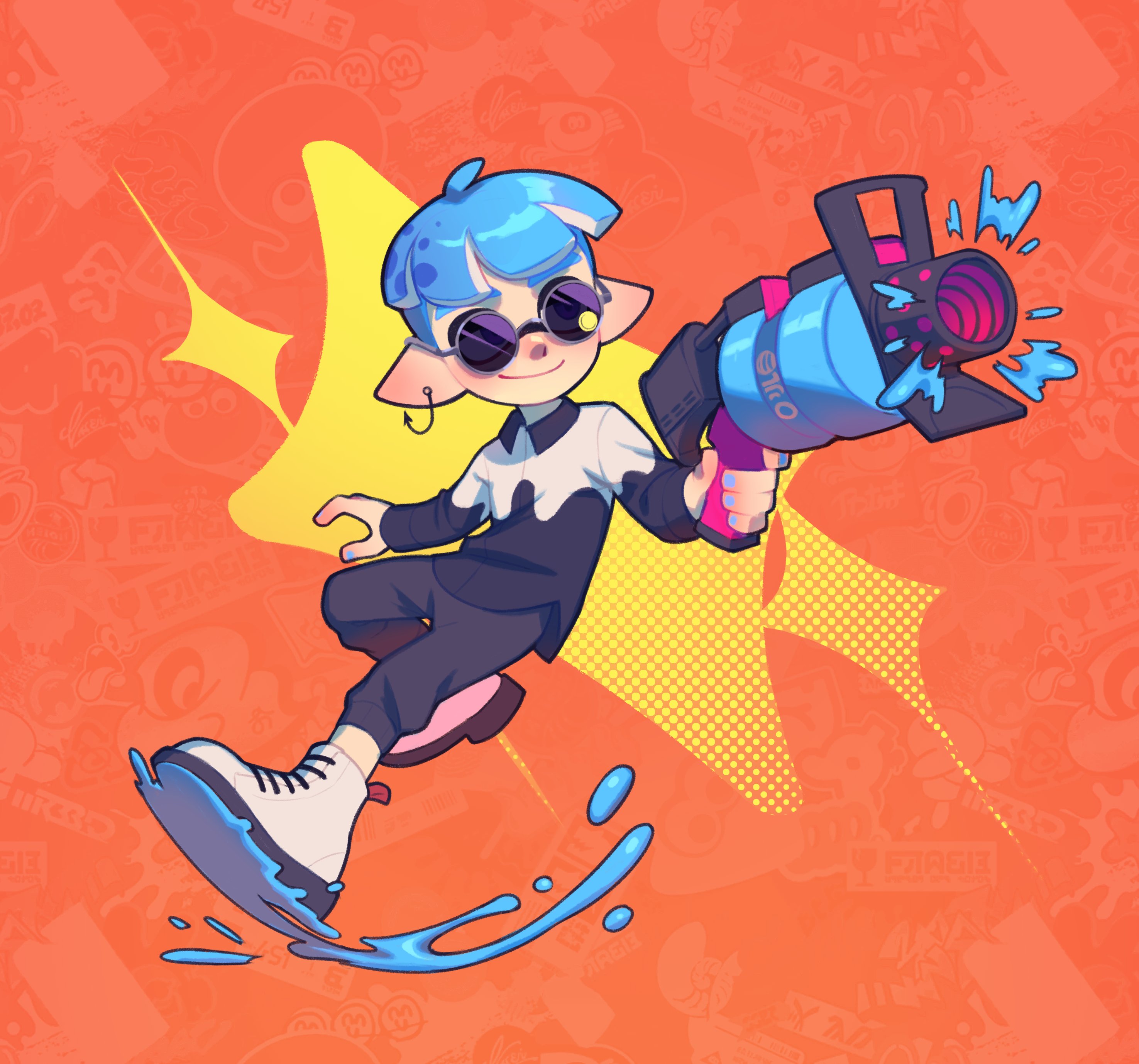 .52_gal_(splatoon) 1boy absurdres anchor_earrings black_pants blue_hair closed_mouth commentary earrings english_commentary full_body gun high_tops highres holding holding_gun holding_weapon inkling inkling_boy inkling_player_character jewelry nintendo orange_background paint pants pointy_ears radsakee round_eyewear shoes short_hair smile sneakers solo splatoon_(series) splatoon_3 sunglasses tentacle_hair weapon white_shoes
