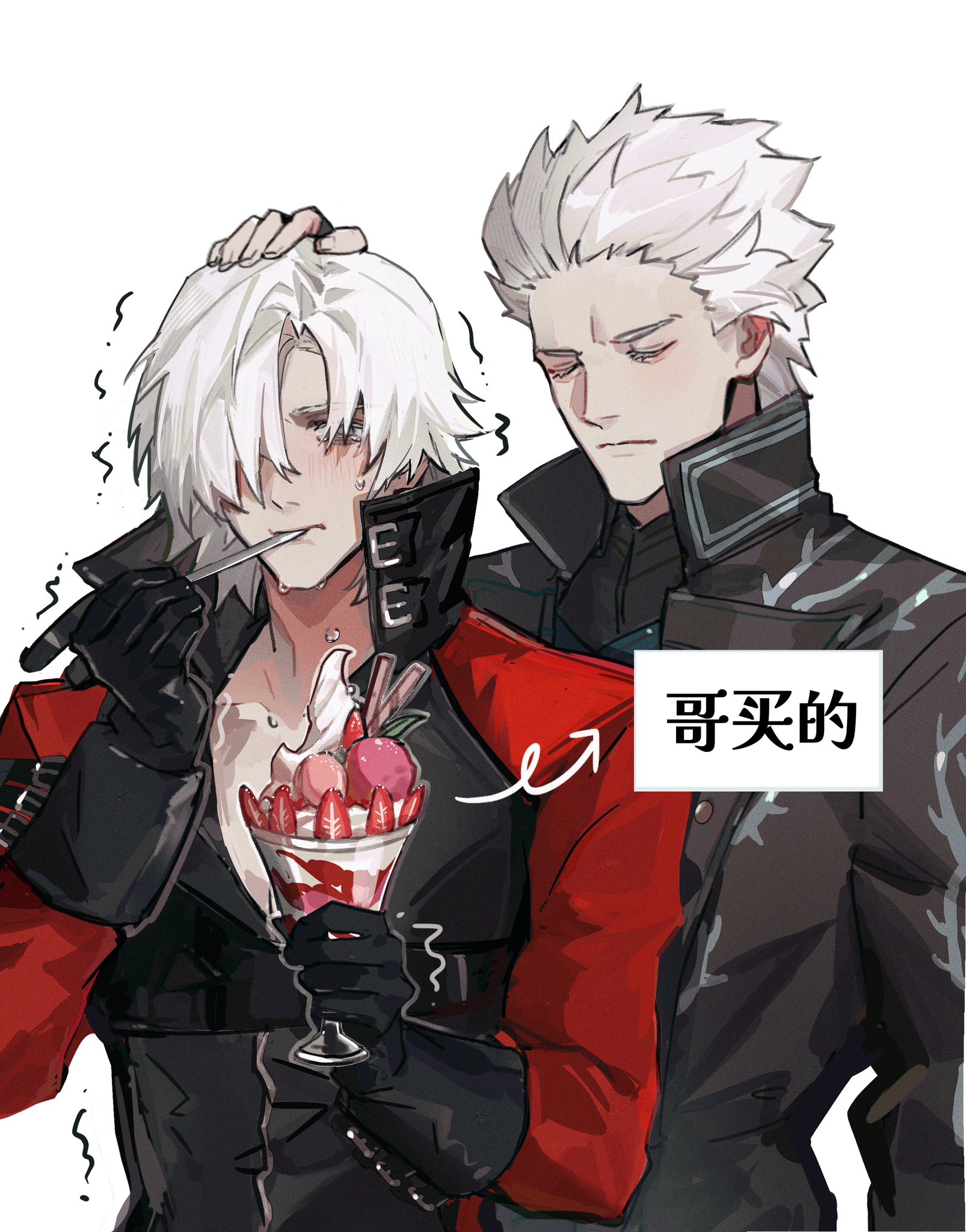 2boys belt black_gloves blue_eyes closed_mouth coat dante_(devil_may_cry) demon_boy devil_may_cry devil_may_cry_(series) devil_may_cry_2 devil_may_cry_5 eating fingerless_gloves gloves hair_over_one_eye hair_slicked_back highres holding long_hair male_focus multiple_boys red_coat simple_background vergil_(devil_may_cry) white_hair www_(1184187582) yamato_(sword)