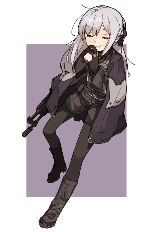 1girl ak-12 ak-12_(girls'_frontline) amonitto assault_rifle belt black_boots black_gloves black_pantyhose black_shirt black_shorts boots buckle closed_eyes closed_mouth full_body girls'_frontline gloves grey_hair gun hand_up holding holding_gun holding_weapon jacket jacket_on_shoulders kalashnikov_rifle long_hair long_sleeves pantyhose partially_fingerless_gloves pouch rifle shirt shorts smile snap-fit_buckle solo weapon