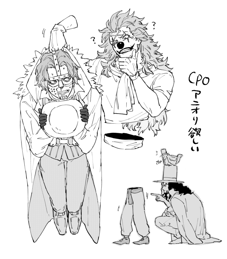 bird black_hair buggy_the_clown clown clown_nose facial_hair gloves hat hattori_(one_piece) holding hook_hand imanatsu leather_mask long_hair makeup male_focus mask multiple_boys one_piece pigeon rob_lucci shirt spandam teeth
