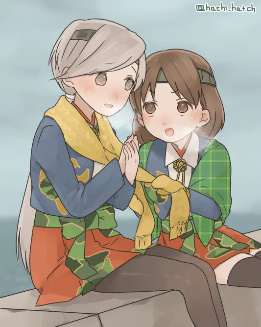 2girls blanket blazer blouse brown_eyes brown_hair chitose_(kancolle) chiyoda_(kancolle) cold gloves grey_eyes grey_hair hakama hakama_skirt headband jacket kantai_collection long_hair medium_hair multiple_girls pantyhose ponytail rubbing_hands_together scarf shirt sitting skirt tassel thighhighs