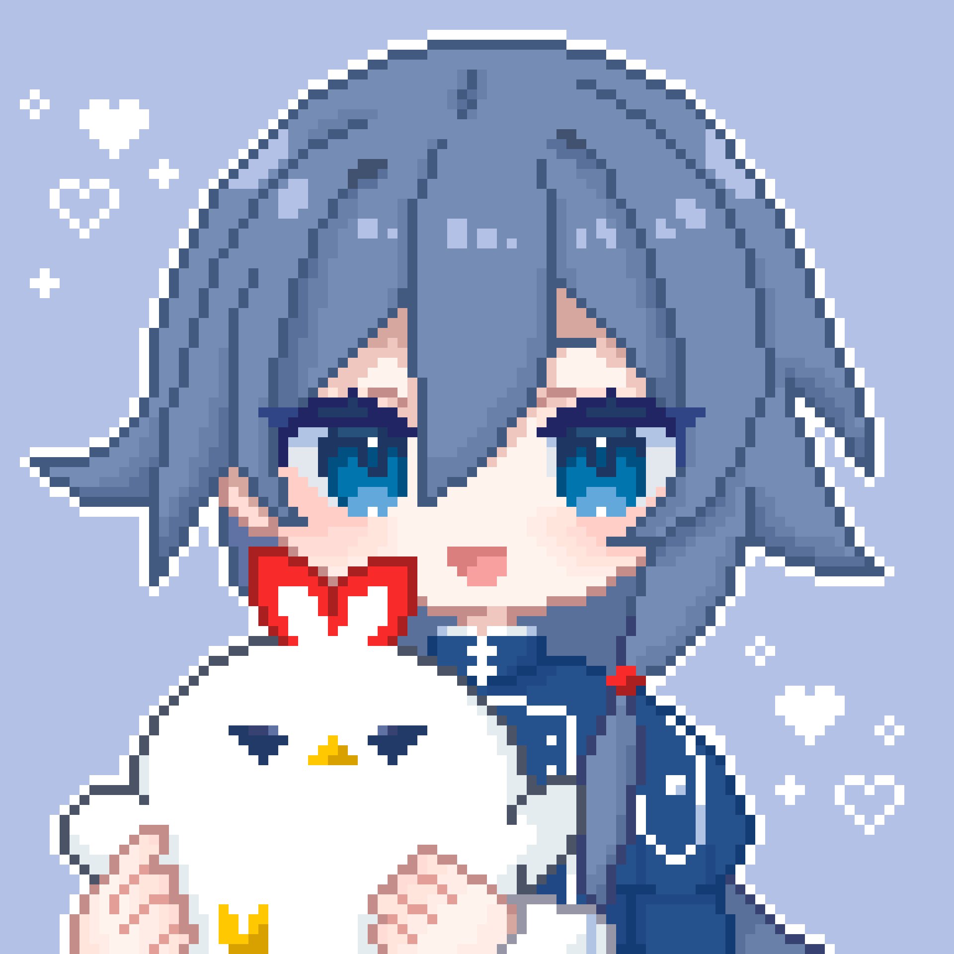1girl :d animal bird blue_background blue_sleeves chinese_clothes fu_hua fu_hua_(valkyrie_accipiter) grey_hair heart highres holding honkai_(series) honkai_impact_3rd jingwei_(bird) long_hair looking_at_viewer low-tied_long_hair low_ponytail open_mouth pixel_art ponytail simple_background smile xtx_mercury