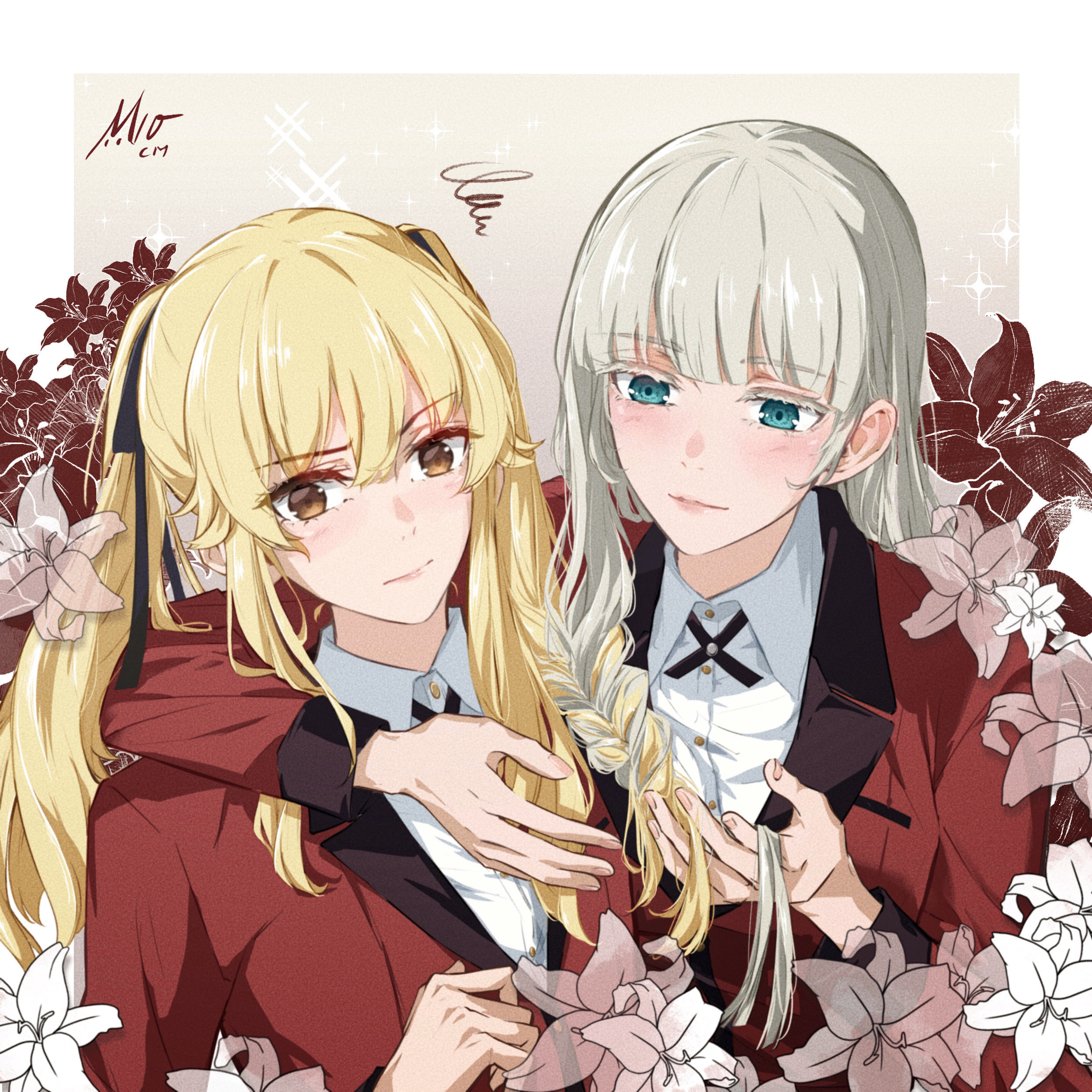 2girls absurdres annoyed black_ribbon blazer blonde_hair blue_eyes blunt_bangs blush braid braiding_hair brown_eyes closed_mouth collared_shirt colored_eyelashes cross_tie flower hair_between_eyes hair_over_shoulder hair_ribbon hairdressing hand_in_another's_hair hands_in_hair highres hyakkaou_academy_school_uniform jacket kakegurui light_smile lily_(flower) long_bangs long_hair long_sleeves m10cmdesu momobami_ririka multiple_girls neck_ribbon red_jacket ribbon saotome_mary school_uniform shirt sidelocks signature simple_background single_braid sitting sparkle suit_jacket twintails tying_hair white_flower white_hair white_lily white_shirt yuri