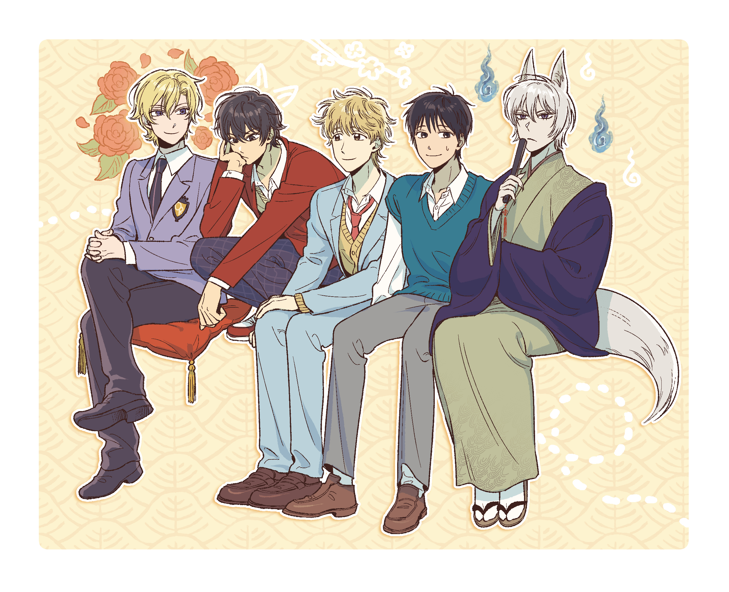 animal_ears black_hair black_pants blazer blonde_hair blue_fire blue_pants brown_footwear cardigan closed_mouth collared_shirt crossed_legs crossover cushion fire floral_background flower folded_fan folding_fan fox_boy fox_ears fox_tail from_side frown full_body gatan666 grey_hair grey_kimono grey_pants hand_fan hand_on_own_cheek hand_on_own_face hand_up haori head_rest highres hitodama holding holding_fan invisible_chair jacket japanese_clothes kamisama_hajimemashita kazehaya_shouta kimi_ni_todoke kimono korean_commentary legs_together loafers long_sleeves looking_at_another looking_at_viewer looking_down looking_to_the_side male_focus multiple_crossover necktie nervous ouran_high_school_host_club ouran_high_school_uniform pants petals purple_jacket red_flower red_footwear red_jacket red_necktie sandals school_uniform shima_sousuke shirt shoe_soles shoes short_hair side-by-side sitting skip_to_loafer smile socks squatting suou_tamaki sweater_vest tabi tail tomoe_(kamisama_hajimemashita) tonari_no_kaibutsu-kun trait_connection white_fire white_shirt white_socks yoshida_haru zabuton zouri