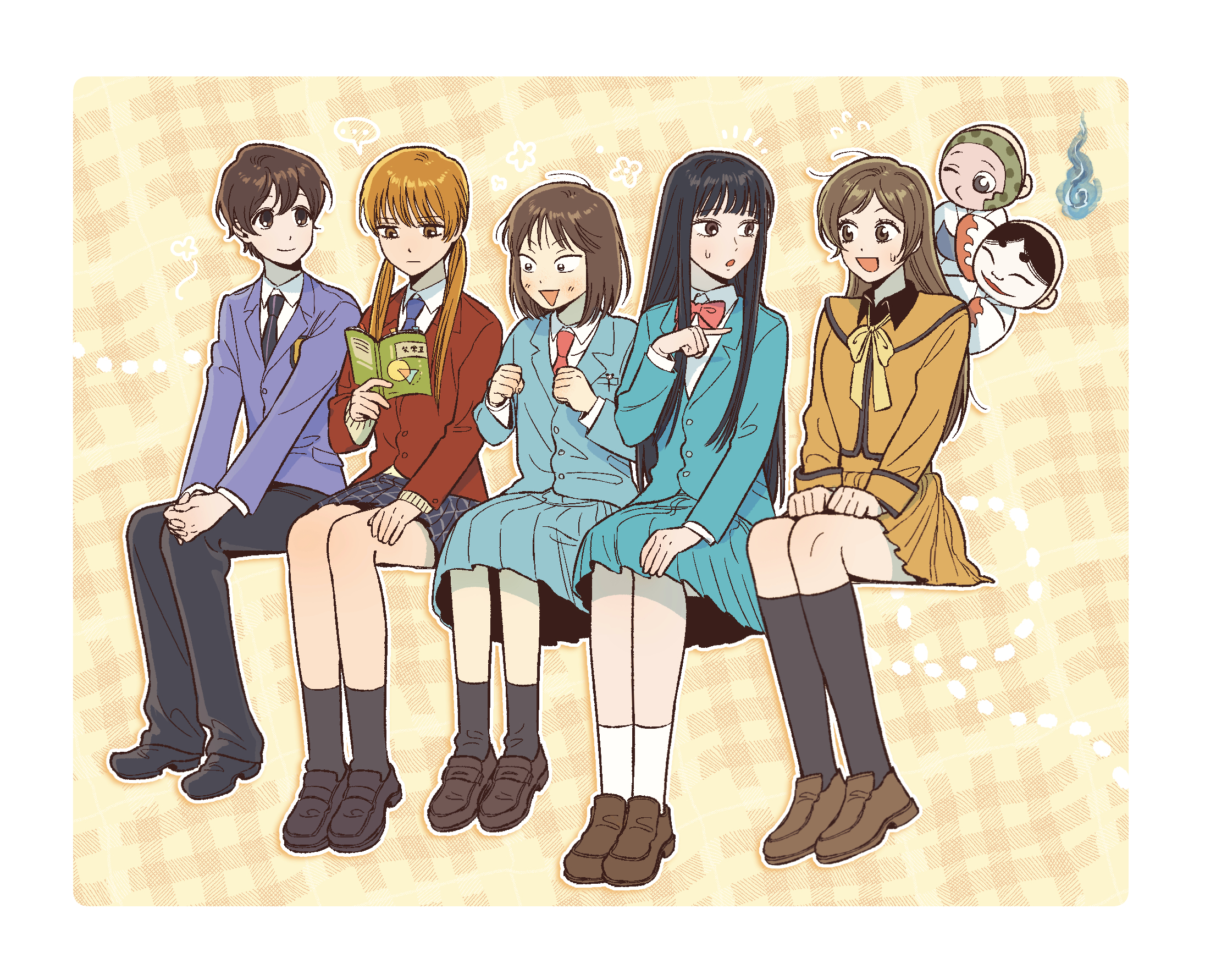 1boy 6+girls black_footwear black_hair black_necktie blazer blue_fire blue_jacket blue_necktie blue_skirt bob_cut book bow bowtie brown_eyes brown_footwear brown_hair crossdressing crossdressing_(ftm) crossover expressionless fire from_side fujioka_haruhi full_body gatan666 grey_pants grey_socks hair_over_shoulder hand_up hands_up highres hitodama holding holding_book invisible_chair iwakura_mitsumi jacket japanese_clothes kamisama_hajimemashita kimi_ni_todoke kimono kneehighs korean_commentary kotetsu_(kamisama_hajimemashita) kuronuma_sawako loafers long_hair long_sleeves looking_at_another looking_down looking_to_the_side low_twintails miniskirt mizutani_shizuku momozono_nanami multiple_crossover multiple_girls necktie nervous one_eye_closed onikiri_(kamisama_hajimemashita) open_book orange_hair ouran_high_school_host_club ouran_high_school_uniform own_hands_together pants pleated_skirt pointing pointing_at_another reading red_bow red_bowtie red_jacket reverse_trap school_uniform shoes short_hair side-by-side sitting skip_to_loafer skirt socks straight_hair sweatdrop tonari_no_kaibutsu-kun trait_connection twintails yellow_bow yellow_bowtie yellow_jacket yellow_skirt