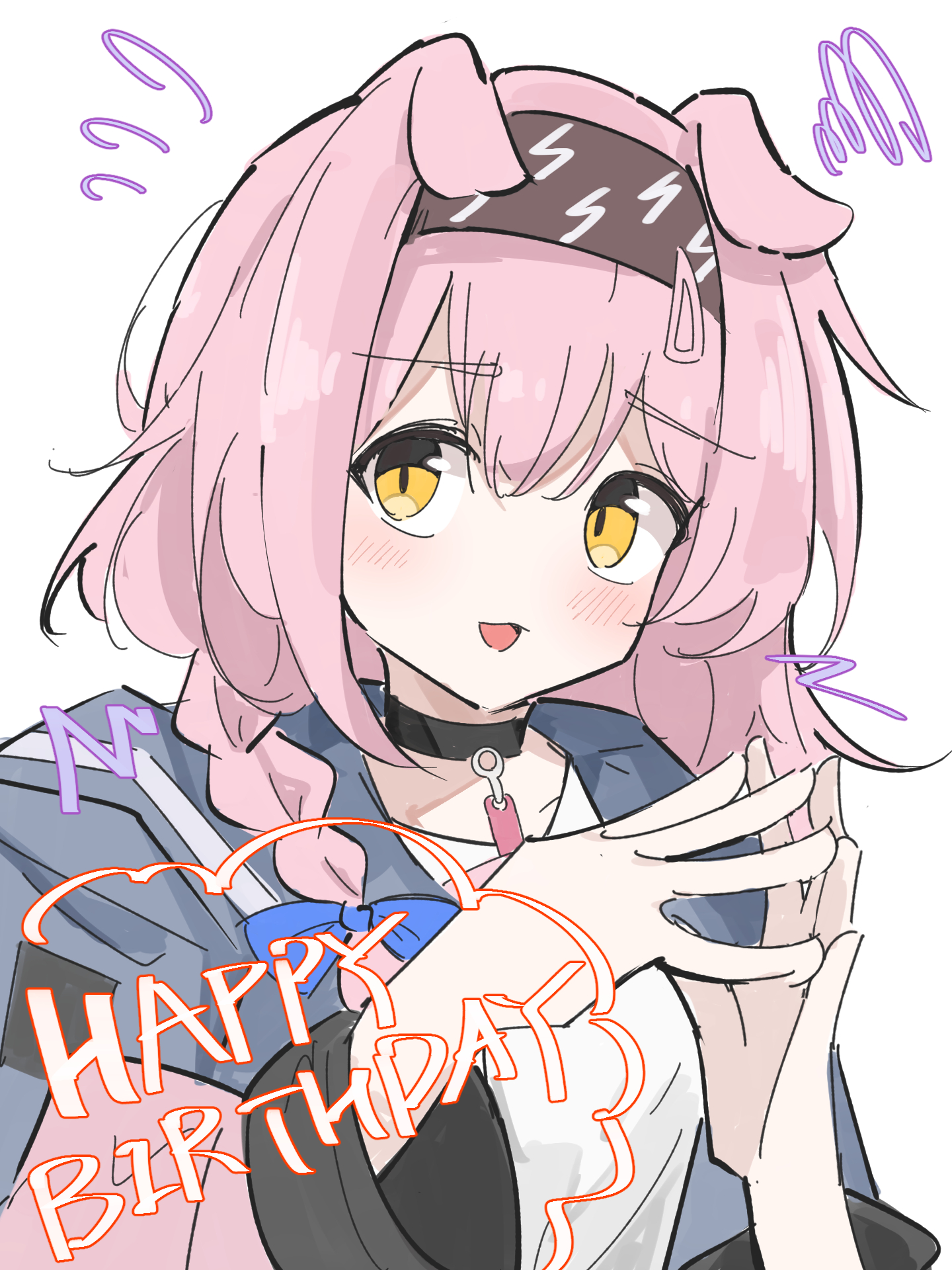 1girl animal_ears arknights black_hairband blue_bow blue_jacket blush bow braid cat_ears cat_girl enunomiya floppy_ears goldenglow_(arknights) hair_between_eyes hair_bow hair_ornament hairband hairclip happy_birthday highres jacket lightning_bolt_print long_sleeves looking_at_viewer multicolored_jacket open_clothes open_jacket open_mouth pink_hair pink_jacket shirt solo squiggle steepled_fingers two-tone_jacket upper_body white_shirt yellow_eyes