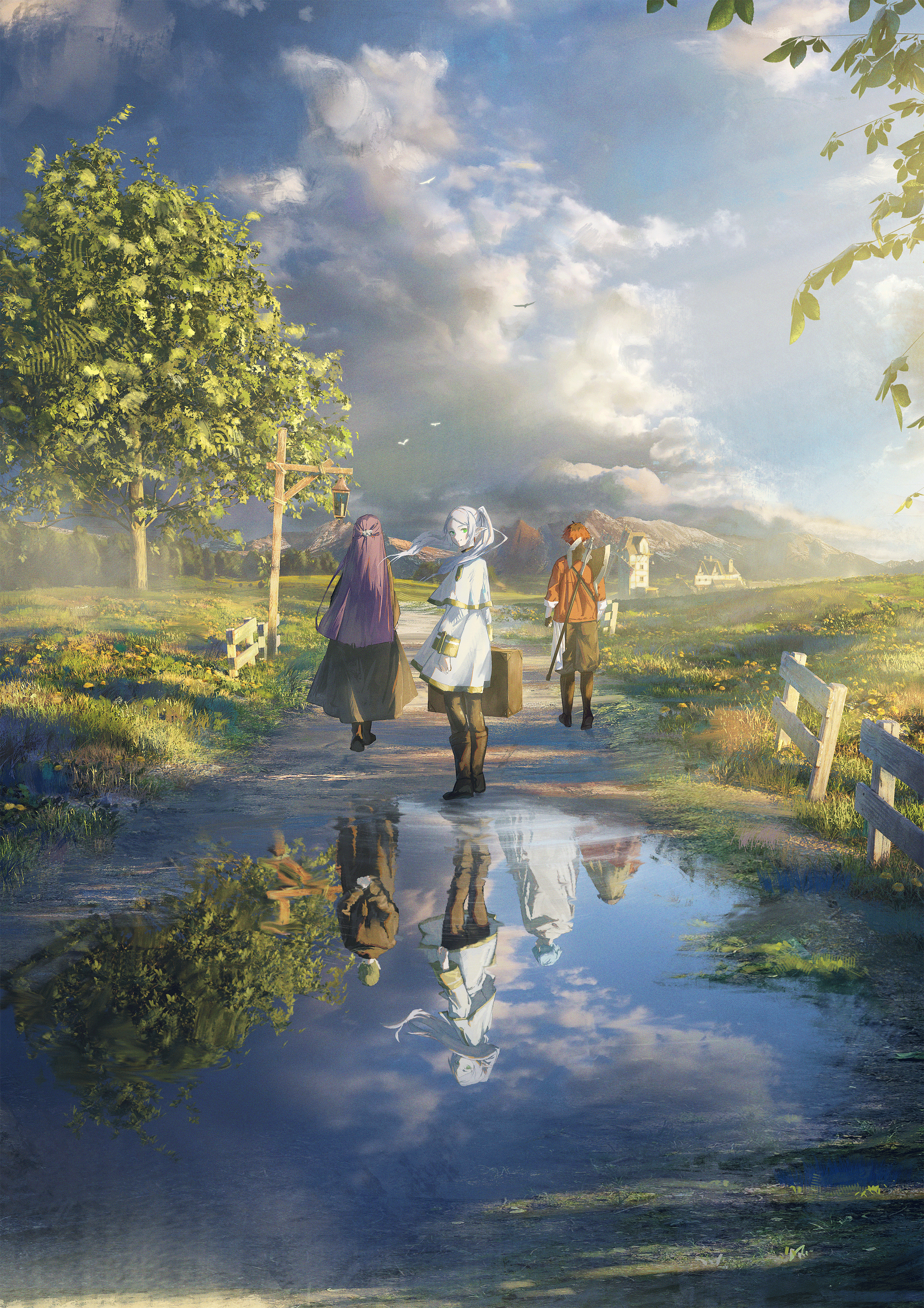 2girls 4boys absurdres arms_behind_back axe battle_axe black_coat black_gloves blue_tunic boots building butterfly_hair_ornament cape capelet cloak cloud coat commentary_request different_reflection dress dwarf eisen_(sousou_no_frieren) elf fake_horns fern_(sousou_no_frieren) fingerless_gloves frieren from_behind gloves grass green_eyes gyoukan_(jfxc) hair_ornament heiter helmet highres himmel_(sousou_no_frieren) holding holding_behind_back holding_suitcase holding_weapon_behind_back horned_helmet horns lamppost long_coat long_hair looking_back mountainous_horizon multiple_boys multiple_girls pantyhose pointy_ears purple_hair red_cape red_coat red_hair reflection road short_hair sky sousou_no_frieren stark_(sousou_no_frieren) straight_hair suitcase traffic_barrier tree tunic twintails walking water weapon white_cape white_capelet white_cloak white_dress white_hair