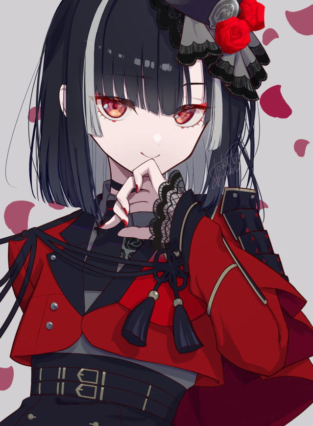 1boy belt blunt_ends collared_shirt colored_inner_hair cropped_jacket eyeshadow falling_petals flower grey_hair hand_on_own_chin hat high-waist_pants jacket kyogoku_masamune lace-trimmed_sleeves lace_trim long_sleeves looking_at_viewer makeup male_focus mini_hat multicolored_hair nail_polish necktie pants petals red_eyes red_eyeshadow rose shirt shirt_tucked_in short_hair side_cape smile solo tokifuji_kougetsu touken_ranbu trap upper_body