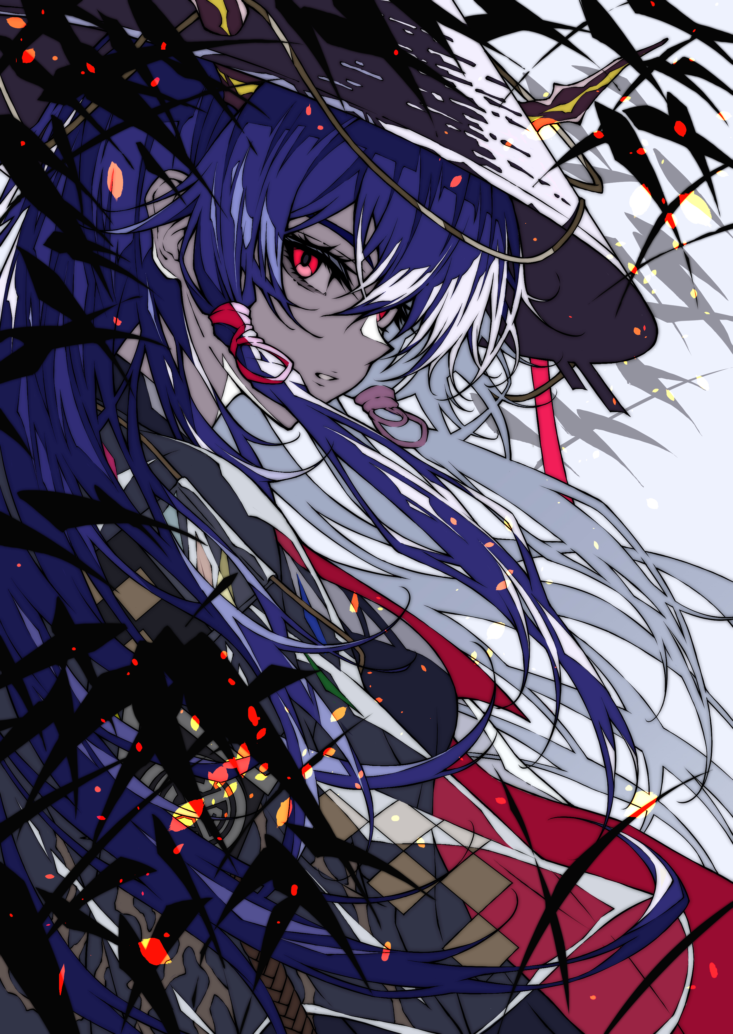 1girl absurdres arknights blue_hair ch'en_(arknights) ch'en_the_holungday_(arknights) dragon_girl dragon_horns hat highres horns horns_through_headwear hoshiguma_(arknights) long_hair looking_at_viewer official_alternate_costume red_eyes shokikanes solo staring upper_body very_long_hair white_background