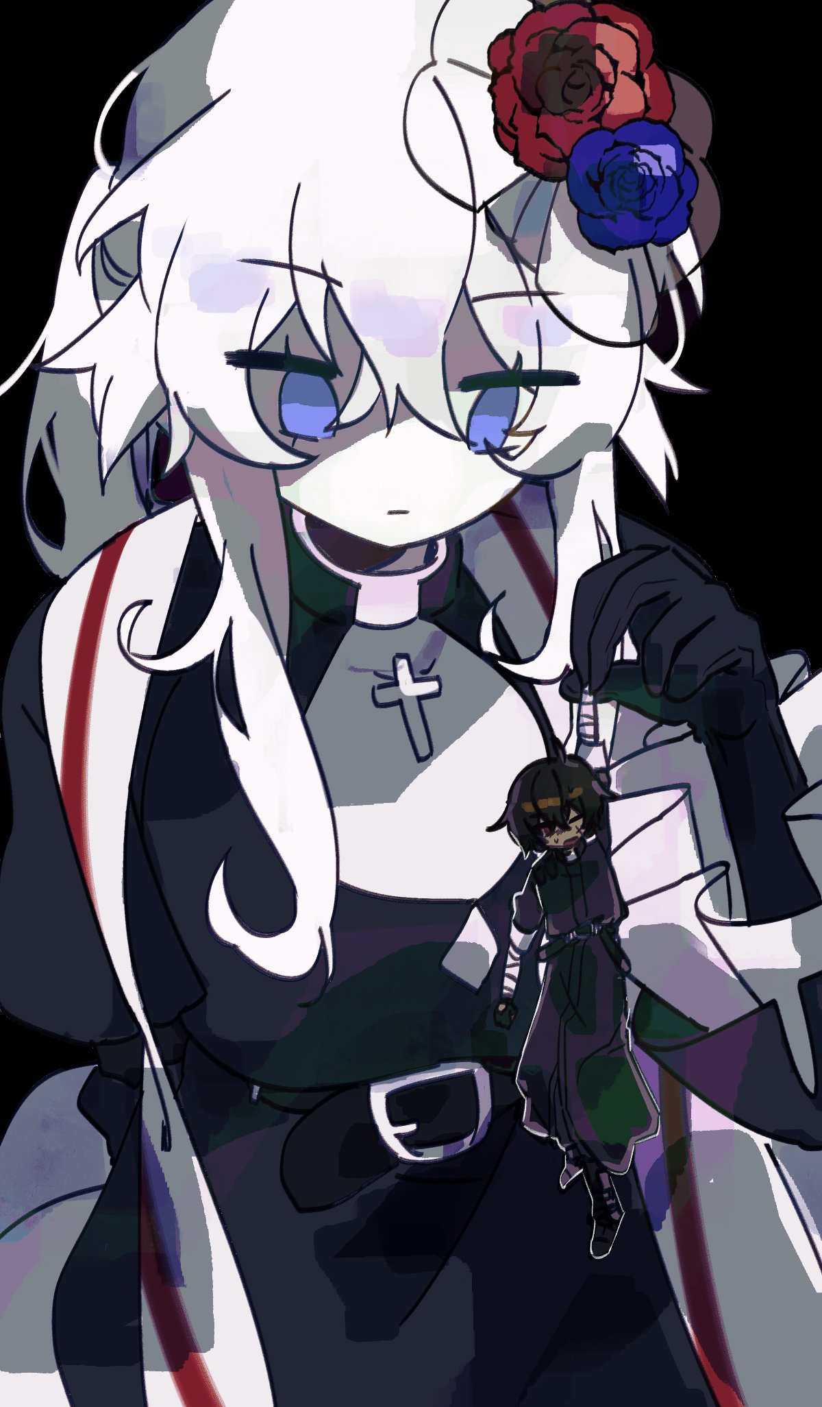 1boy 1girl bandaged_arm bandages belial_(happy_saint_sheol) belt black_background black_dress black_gloves black_hair blue_eyes dark-skinned_male dark_skin dress expressionless flower gloves hair_flower hair_ornament haku_eckaran happy_saint_sheol highres looking_down ponytail qcu_ssn shaded_face sidelocks turtleneck white_dress white_hair