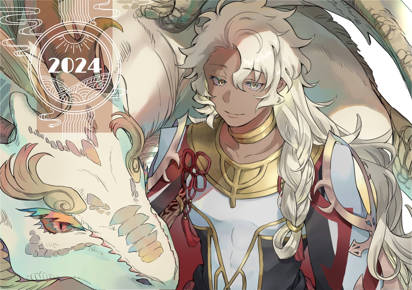 1boy 2024 arm_tattoo braid chinese_zodiac closed_mouth dark-skinned_male dark_skin doro_(kura-chou) dragon fate/grand_order fate_(series) flower_knot jewelry long_hair looking_at_viewer male_focus neck_ring new_year side_braid simple_background single_braid smile solo solomon_(fate) tattoo upper_body white_background white_hair year_of_the_dragon yellow_eyes