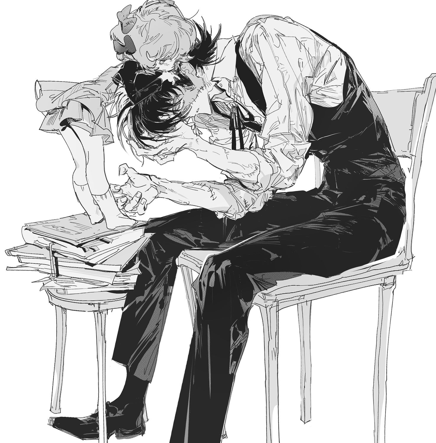 1boy 1girl black_footwear black_hair black_jack_(character) black_jack_(series) black_pants book bow chair dress gek3y greyscale hair_bow highres leaning monochrome on_chair pants pinoko short_hair sitting socks stitched_face stitches stool white_background