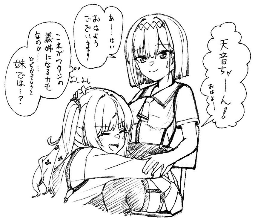 2girls :d ^_^ arm_around_another's_waist bob_cut closed_eyes closed_mouth commentary flower hair_between_eyes hair_flower hair_ornament headpat hug kohibari_kurumi long_hair long_sleeves looking_at_another monochrome multiple_girls open_mouth school_uniform shirt short_hair short_sleeves simple_background sitting sketch skirt smile sound_effects speech_bubble split_mouth suspender_skirt suspenders sweatdrop tanikaze_amane tenshi_souzou_re-boot! tft_(tft7822) thigh_strap thighhighs translated twintails white_background zettai_ryouiki