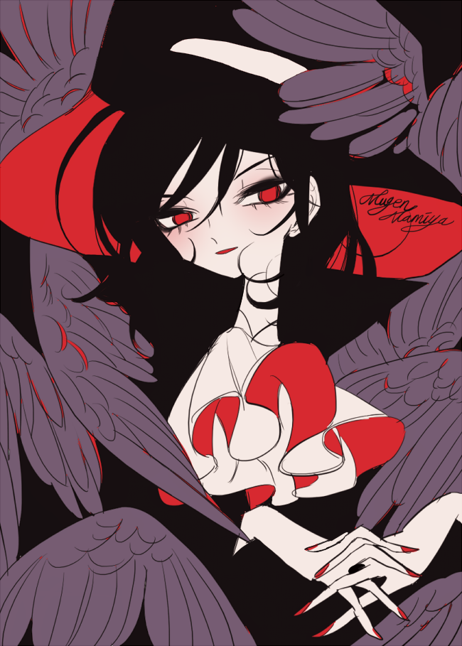 1boy ascot blending character_name commentary_request feathered_wings grey_wings hair_between_eyes limited_palette looking_at_viewer male_focus meremero mugen_mamiya mugen_shinshi own_hands_together red_eyes red_nails smile solo upper_body wings
