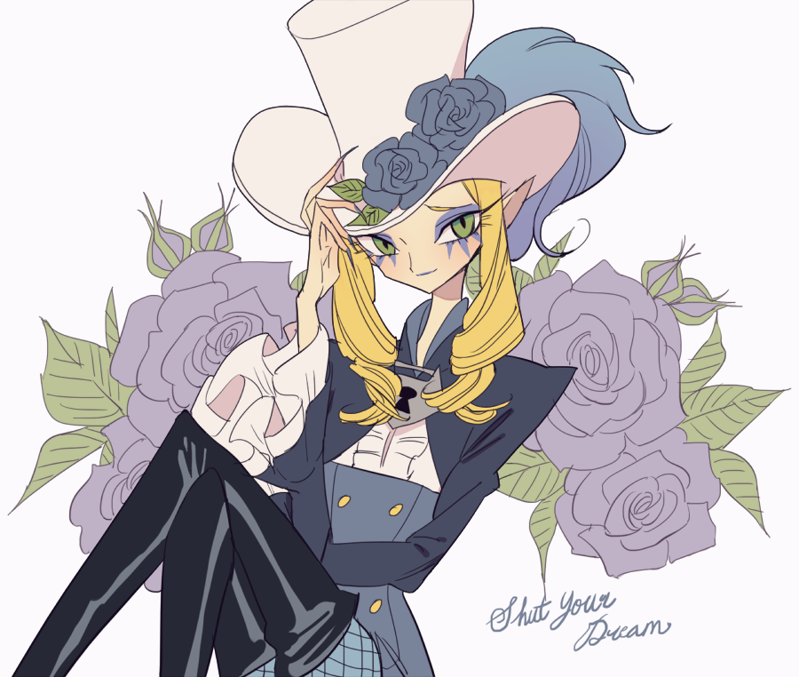 1boy androgynous blonde_hair blue_flower blue_rose closed_mouth commentary_request floral_print flower go!_princess_precure green_eyes hat hat_flower keyhole knees_up lock long_hair long_sleeves looking_at_viewer makeup male_focus meremero pointy_ears precure purple_flower purple_rose rose shut_(precure) sitting smile solo top_hat white_background white_hat