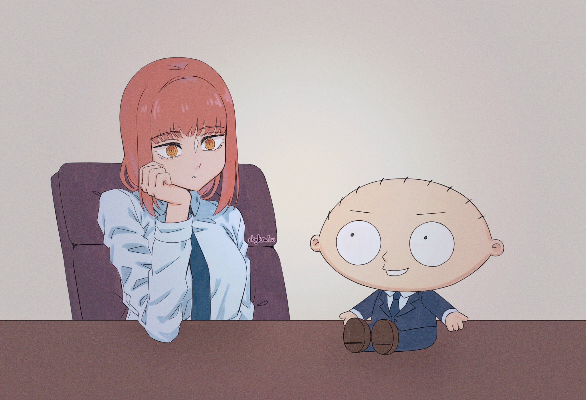 1boy 1girl blue_necktie blue_pants blue_suit business_suit chainsaw_man chair collared_shirt desk family_guy formal_clothes hand_on_own_chin highres indoors jacket makima_(chainsaw_man) necktie on_desk orange_eyes pants red_hair ringed_eyes rkgkrabu shirt sitting on_desk stewie_griffin suit suit_jacket white_shirt