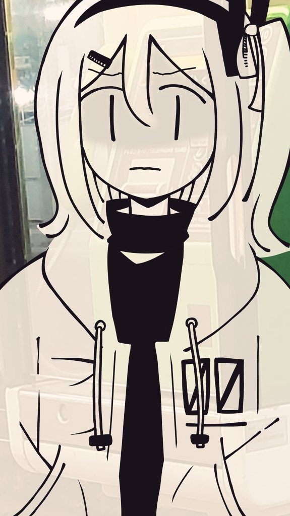 1girl a.i._voice adachi_rei check_commentary closed_mouth co8 commentary_request drawstring frown jacket long_sleeves looking_at_viewer one_side_up open_clothes open_jacket partially_colored phone_booth photo_background shirt solo translucent turtleneck upper_body utau v-shaped_eyebrows wavy_mouth |_|
