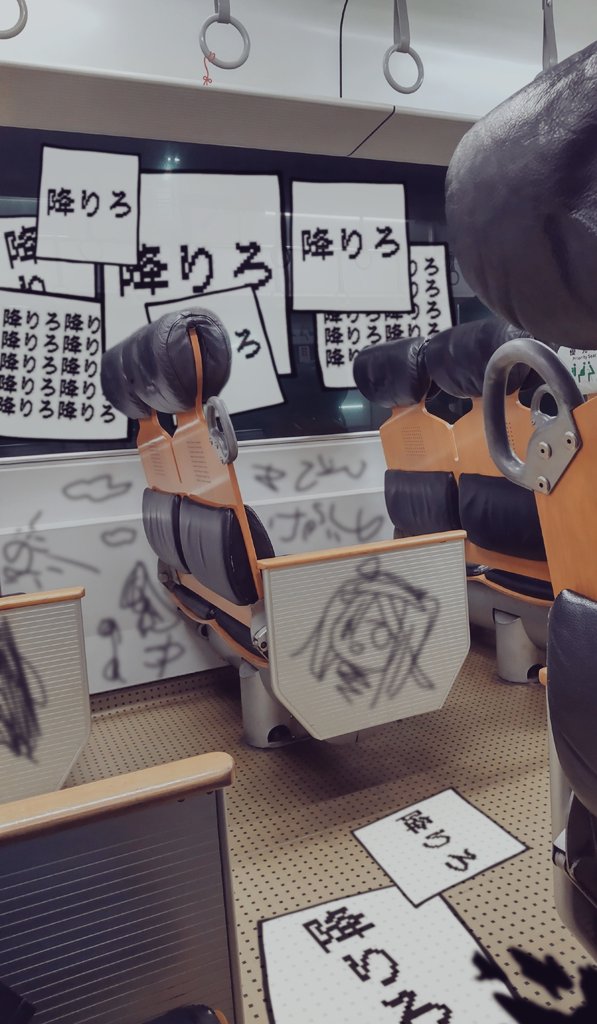 a.i._voice adachi_rei co8 commentary doodles graffiti hand_grip no_humans photo_background pixelated sign train_interior utau