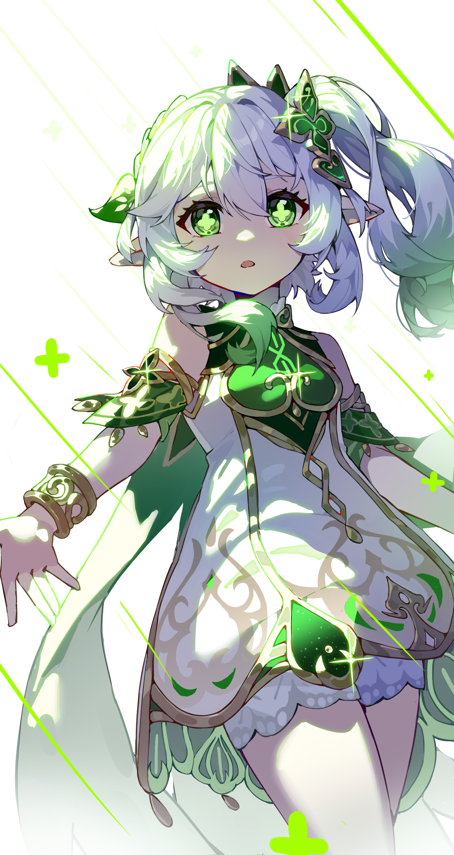 1girl absurdres alan_lan_lan bloomers bracelet braid commentary_request crown_braid detached_sleeves dress flower-shaped_pupils genshin_impact gradient_hair green_eyes hair_between_eyes hair_ornament highres jewelry leaf_hair_ornament long_hair looking_at_viewer multicolored_hair nahida_(genshin_impact) parted_lips pointy_ears short_sleeves side_ponytail sidelocks simple_background solo streaked_hair symbol-shaped_pupils two-tone_hair underwear white_background white_bloomers white_dress white_hair