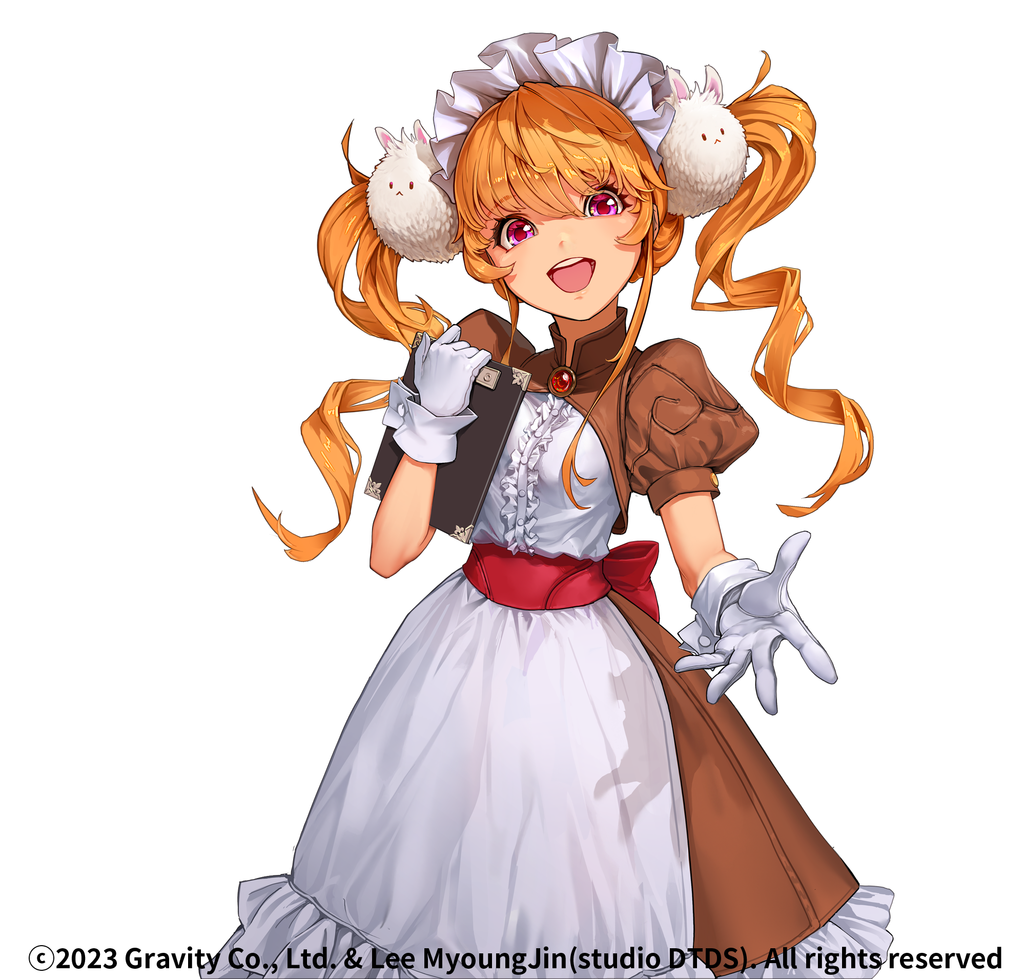 1girl apron blonde_hair brooch brown_dress clipboard commentary_request cowboy_shot curly_sue dress drill_hair frilled_apron frilled_dress frills gloves hair_ornament highres holding holding_clipboard jewelry kafra_uniform long_hair looking_at_viewer lunatic_(ragnarok_online) maid maid_headdress myo-zin open_mouth orange_hair pink_eyes puffy_short_sleeves puffy_sleeves rabbit_hair_ornament ragnarok_online red_sash sash short_sleeves simple_background smile solo teeth transparent_background twin_drills twintails upper_teeth_only watermark white_apron white_gloves
