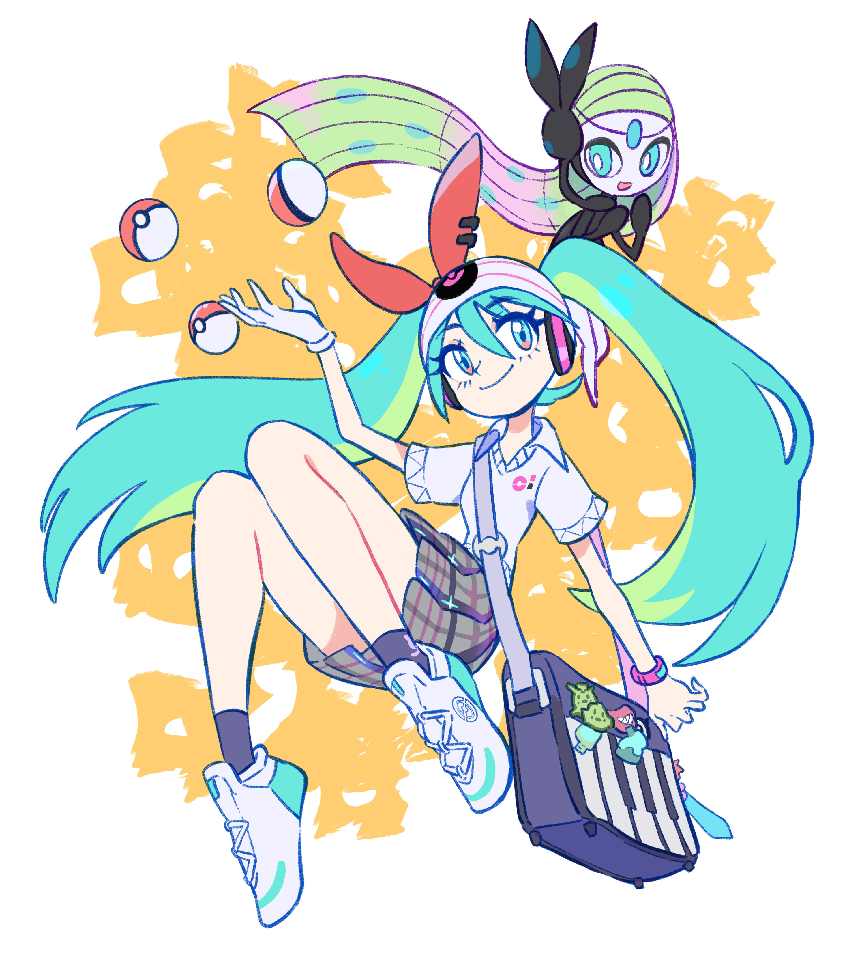 absurdres gen_5_pokemon hatsune_miku highres legendary_pokemon meloetta miniskirt mythical_pokemon nintendo oe_(yamifuti) pokemon project_voltage psychic_miku_(project_voltage) skirt twintails vocaloid