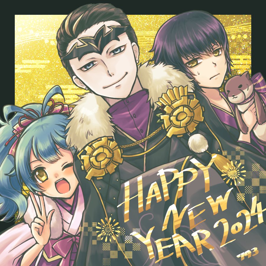 1girl 2024 2boys 793_(oo793oo) ;d alternate_costume black_hair blue_eyes blue_hair fafnir_(fire_emblem) fafnir_(new_year)_(fire_emblem) fire_emblem fire_emblem_heroes happy_new_year japanese_clothes kimono looking_at_viewer multiple_boys new_year nintendo official_alternate_costume one_eye_closed open_mouth otr_(fire_emblem) ponytail reginn_(fire_emblem) reginn_(new_year)_(fire_emblem) smile sweatdrop w yellow_eyes