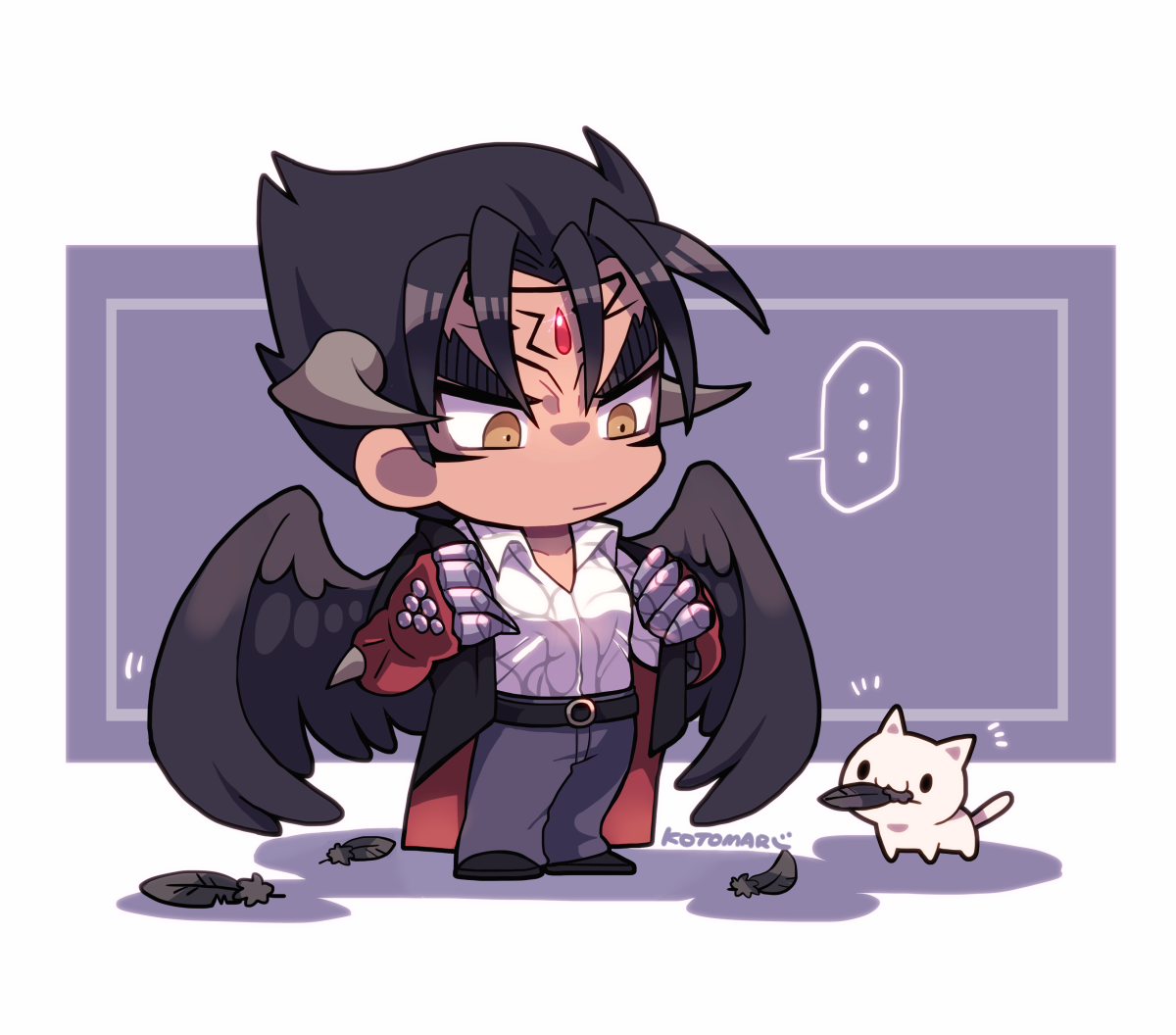 ... 1boy animal belt black_belt black_coat black_feathers black_hair black_shoes cat chibi coat collared_shirt devil_jin dressing feather_in_mouth feathered_wings feathers forehead_jewel full_body gloves grey_horns grey_pants horns kazama_jin kotomaru_(kotokoto_kottan) looking_down male_focus no_nose pants red_gloves shirt shoes solo spoken_ellipsis studded_gloves tekken thick_eyebrows v-shaped_eyebrows white_cat white_shirt wings yellow_eyes