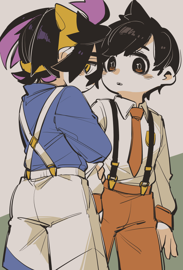 2boys ahoge arm_hug ass black_eyes black_hair blue_shirt breast_pocket brown_eyes collared_shirt colored_inner_hair commentary_request cowboy_shot crossed_bangs florian_(pokemon) from_behind frown green_background hair_between_eyes hairband hand_on_own_arm holding_another's_arm hug kieran_(pokemon) long_sleeves looking_at_viewer looking_back looking_down lunchbox_(artist) male_focus multicolored_eyes multicolored_hair multiple_boys necktie nintendo orange_necktie orange_pants orange_shorts pants parted_lips pocket pokemon pokemon_scarlet_and_violet purple_hair shirt short_hair shorts suspenders teeth two-tone_eyes two-tone_hair upper_teeth_only white_background white_pants white_shirt white_shorts yaoi yellow_eyes yellow_hairband