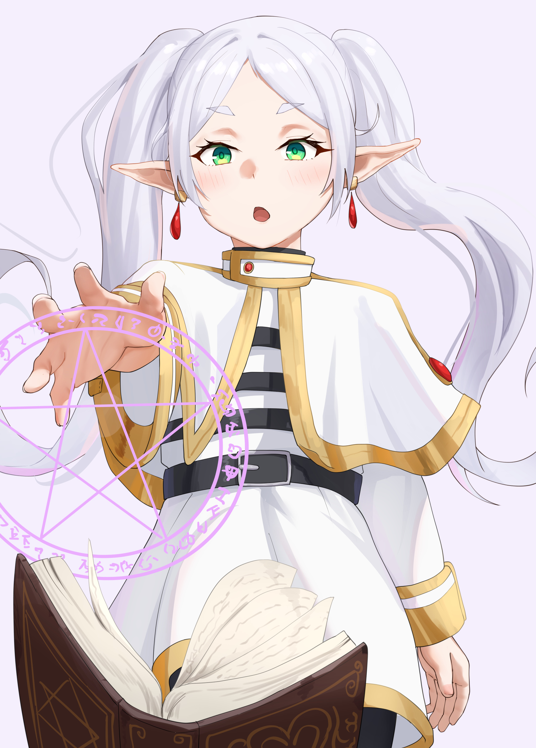 1girl absurdres black_pantyhose book capelet casting_spell earrings elf floating_earrings frieren green_eyes grimoire highres jewelry long_hair magic masamika10086 open_mouth outstretched_arm pantyhose pentagram pointy_ears shirt skirt smile solo sousou_no_frieren striped_clothes striped_shirt twintails white_capelet white_hair white_skirt