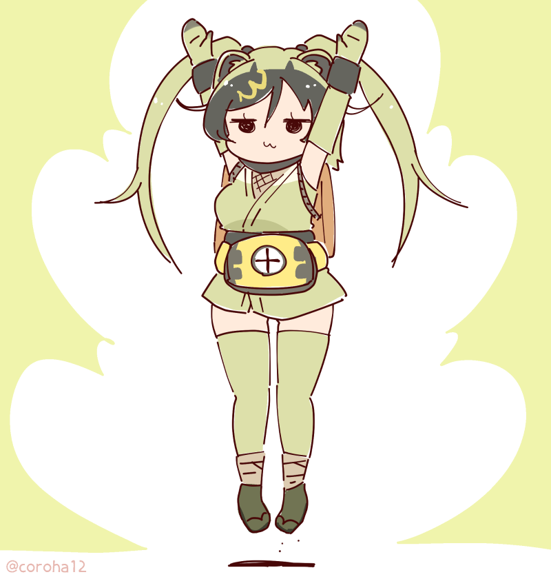 1girl animal_ears arms_up bag coroha elbow_gloves extra_ears full_body gloves green_background green_hair japanese_clothes jumping kamamitsu_(kemono_friends) kemono_friends kimono long_hair looking_at_viewer ninja sandals simple_background sleeveless solo thighhighs twintails weasel_ears weasel_girl zouri