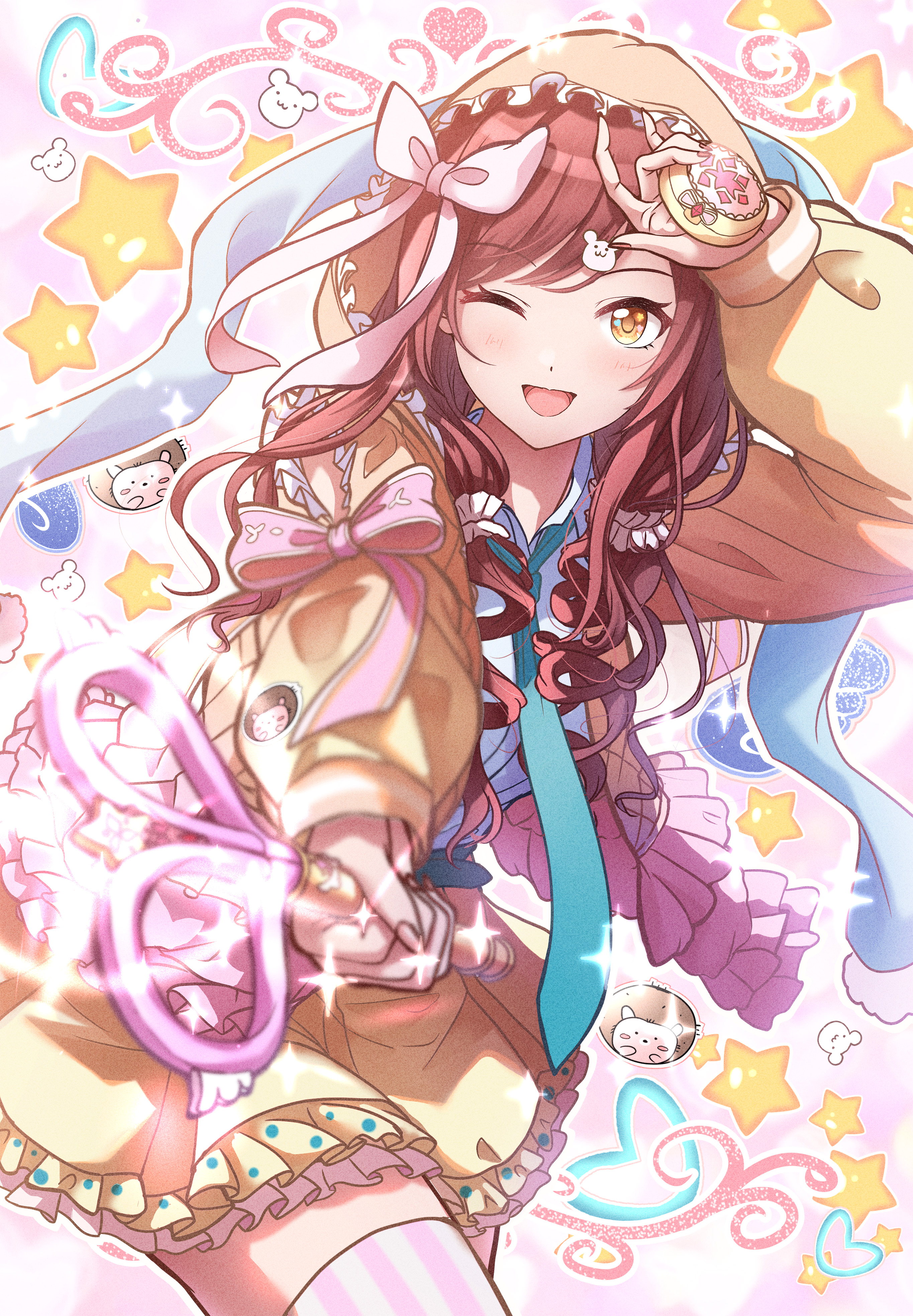 1girl absurdres brown_hair citrusmikan highres idolmaster idolmaster_shiny_colors long_hair long_sleeves looking_at_viewer open_mouth osaki_amana smile solo striped_clothes striped_thighhighs thighhighs vertical-striped_clothes vertical-striped_thighhighs yellow_eyes