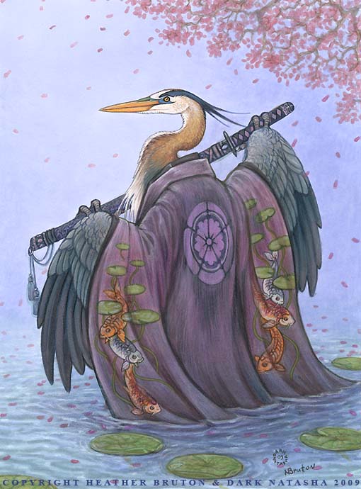 1boy acrylic_paint_(medium) animal animal_focus artist_collaboration artist_name bird cherry_blossoms cherry_tree closed_mouth clothed_animal colored_pencil_(medium) commentary dark_natasha english_commentary falling_petals fish from_behind from_side great_blue_heron heron holding holding_sword holding_weapon in_water japanese_clothes kimono kimono_on_shoulders koi lily_pad looking_at_viewer marker_(medium) no_humans original outdoors painting_(medium) petals purple_kimono samurai solo sword traditional_media weapon winged_arms wings yellow_eyes