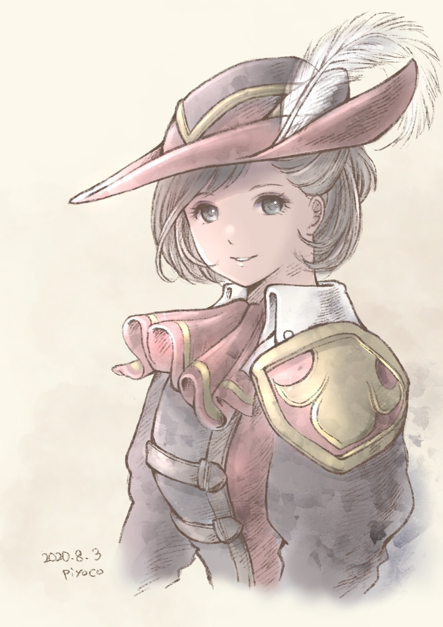 1girl 2020 adventurer_(ff11) artist_name ascot dated eyelashes final_fantasy final_fantasy_xi grey_eyes grey_hair hat hat_feather highres hume looking_at_viewer piyoco red_ascot red_mage_(final_fantasy) short_hair smile solo tricorne upper_body
