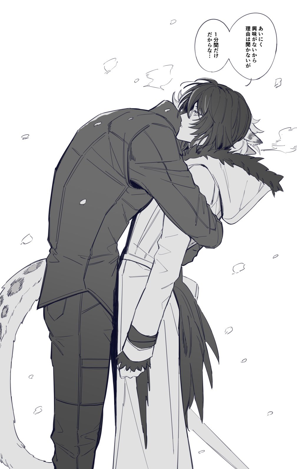 2boys animal_ears arknights black_feathers black_hair black_pants breath clenched_hand collared_shirt feathers from_side fur-trimmed_jacket fur_trim glasses gnosis_(arknights) hichi_(un7c5g) highres hood hood_down hug jacket long_sleeves monochrome multiple_boys pants shirt short_hair silverash_(arknights) simple_background snow snow_leopard_ears snow_leopard_tail snowing speech_bubble tail translation_request white_background white_hair yaoi