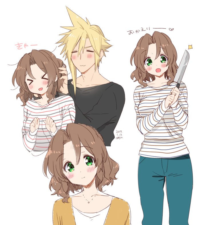 1boy 1girl :3 aerith_gainsborough alternate_costume alternate_hair_length alternate_hairstyle artist_name black_shirt blonde_hair blush breasts brown_hair cardigan casual closed_eyes cloud_strife cowboy_shot dated final_fantasy final_fantasy_vii final_fantasy_vii_remake green_eyes hair_between_eyes hand_in_another's_hair holding holding_knife knife krudears long_sleeves looking_at_viewer medium_breasts multiple_views open_mouth orange_cardigan parted_bangs shirt short_hair smile spiked_hair striped_clothes striped_shirt upper_body wavy_hair white_background
