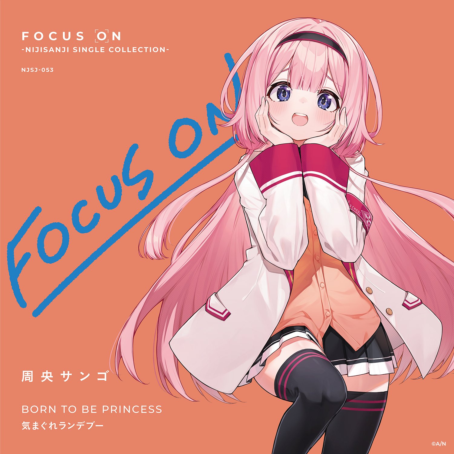 1girl :d album_cover album_name armband artist_name black_hairband black_skirt black_thighhighs blazer blunt_bangs blush cardigan character_name commentary_request copyright_name copyright_notice cover double-parted_bangs hair_between_eyes hairband hands_on_own_chin head_rest highres jacket knee_up long_hair long_sleeves looking_at_viewer low_twintails narita_tamezou nijisanji official_art open_clothes open_jacket open_mouth orange_background orange_cardigan pink_hair pleated_skirt purple_eyes red_armband school_uniform selene_girls_school_uniform skirt smile solo song_name sparkling_eyes suo_sango suo_sango_(1st_costume) teeth thighhighs twintails upper_teeth_only virtual_youtuber white_jacket