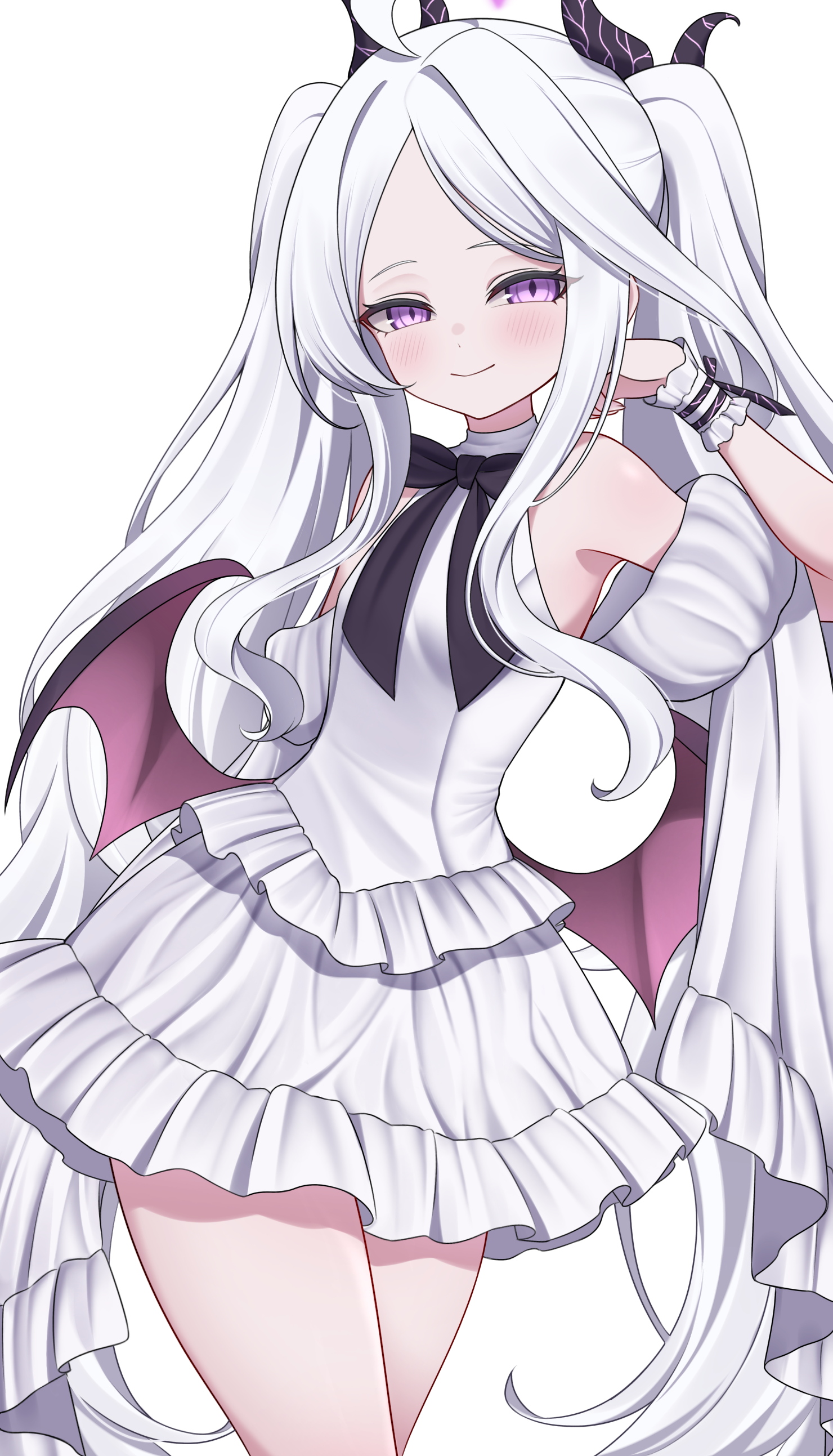 1girl absurdres ahoge alternate_costume alternate_hairstyle aoi_ryo blue_archive commentary_request demon_girl demon_horns demon_wings detached_sleeves dress forehead frilled_dress frills halo highres hina_(blue_archive) horns long_hair looking_at_viewer parted_bangs playing_with_own_hair purple_eyes scrunchie short_sleeves sidelocks simple_background smile solo twintails wavy_hair white_background white_dress white_hair wide_sleeves wings wrist_scrunchie