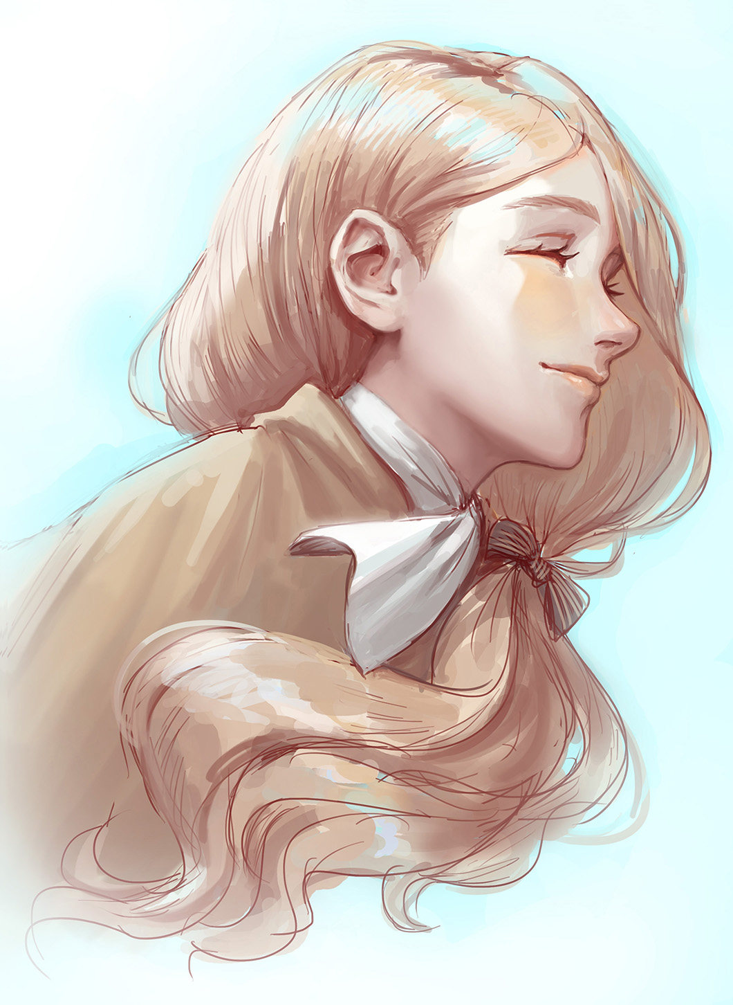 1girl ascot blue_background bow brown_coat closed_eyes coat facing_to_the_side fire_emblem fire_emblem:_three_houses hair_bow hair_over_shoulder highres kazuko_(towa) long_hair low_ponytail low_side_ponytail mercedes_von_martritz nintendo parted_bangs ponytail portrait side_ponytail smile solo striped_bow upper_body wavy_hair white_ascot