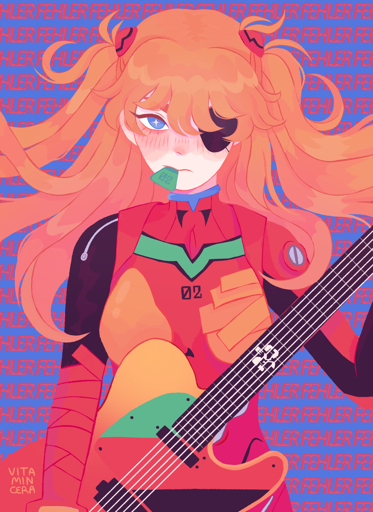 1girl artist_name bad_id bad_twitter_id blue_eyes bodysuit commentary electric_guitar english_commentary evangelion:_3.0_you_can_(not)_redo eyepatch fender_telecaster floating_hair guitar highres holding holding_guitar holding_instrument instrument interface_headset_(evangelion) long_hair looking_at_viewer mecha_pilot_suit mouth_hold neon_genesis_evangelion plectrum plectrum_in_mouth plugsuit_(evangelion) rebuild_of_evangelion red_bodysuit red_hair solo souryuu_asuka_langley star-shaped_pupils star_(symbol) symbol-shaped_pupils upper_body vitamincera