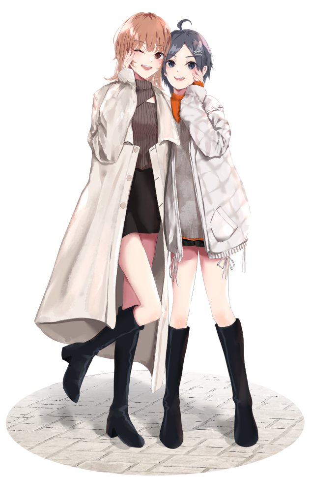 2girls ahoge black_footwear black_hair black_skirt blue_eyes boots brown_hair brown_sweater cleavage_cutout clothing_cutout coat full_body hair_ornament hand_on_own_cheek hand_on_own_face hayase_illusut hikigaya_komachi isshiki_iroha jacket knee_boots looking_at_viewer miniskirt multiple_girls one_eye_closed open_mouth pencil_skirt ribbed_sweater short_hair simple_background skirt smile standing stone_floor sweater upper_body white_background white_coat white_jacket winter_clothes x_hair_ornament yahari_ore_no_seishun_lovecome_wa_machigatteiru.