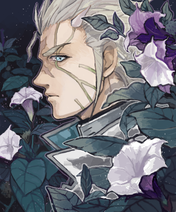 1girl blue_eyes close-up closed_mouth facial_mark flower hair_slicked_back horns ivan_perepelkin looking_at_viewer multicolored_flower nagura purple_flower sideways_glance solo terra_formars white_hair
