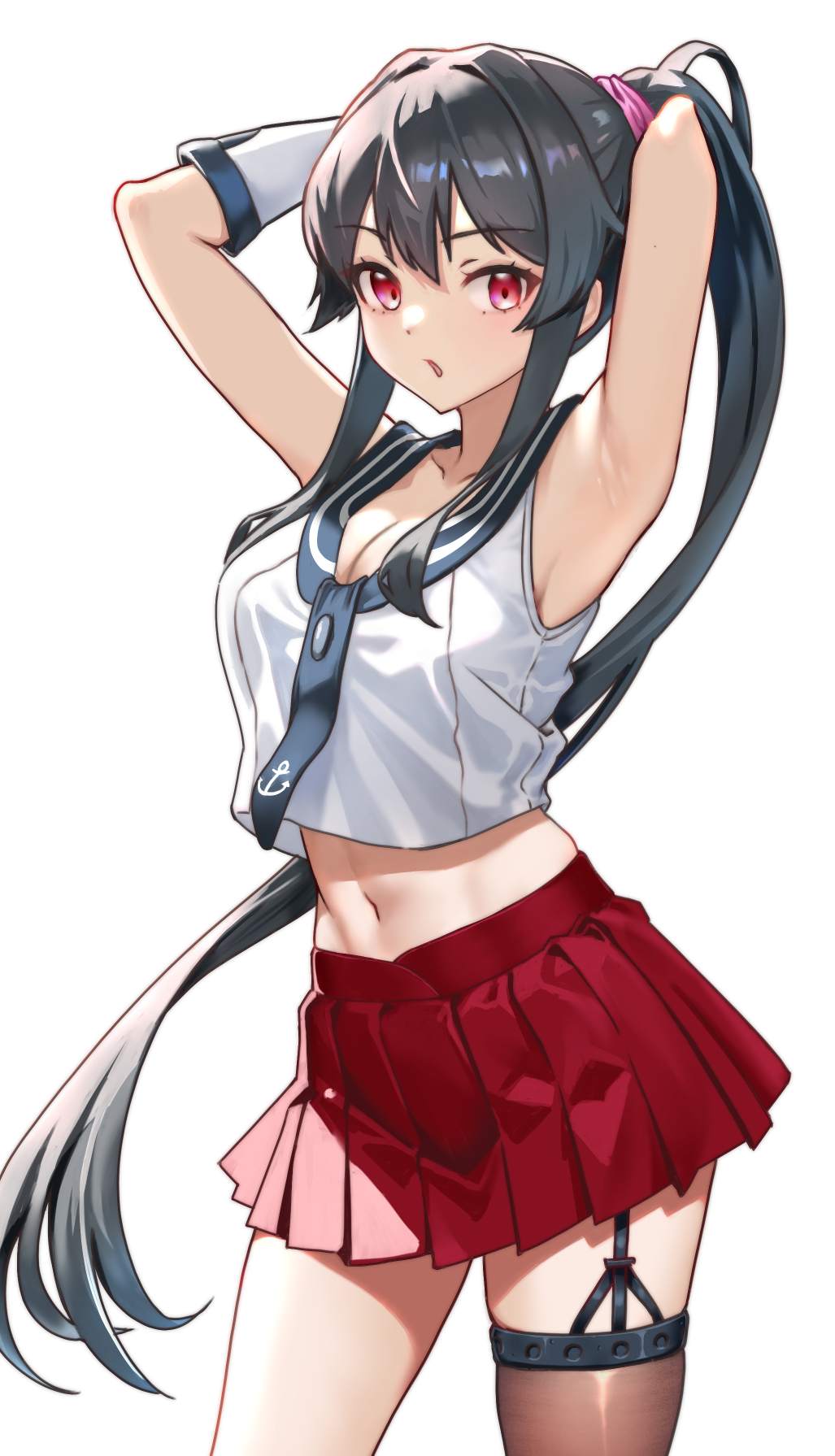 1girl anchor_symbol armpits arms_behind_head asymmetrical_legwear black_hair black_necktie black_sailor_collar garter_straps gloves highres kantai_collection long_hair looking_at_viewer midriff navel necktie pleated_skirt ponytail red_eyes red_skirt sailor_collar school_uniform serafuku shirt sidelocks simple_background single_garter_strap single_thighhigh skirt sleeveless sleeveless_shirt solo thighhighs uneven_legwear very_long_hair white_background white_gloves yahagi_(kancolle) yamano_rita