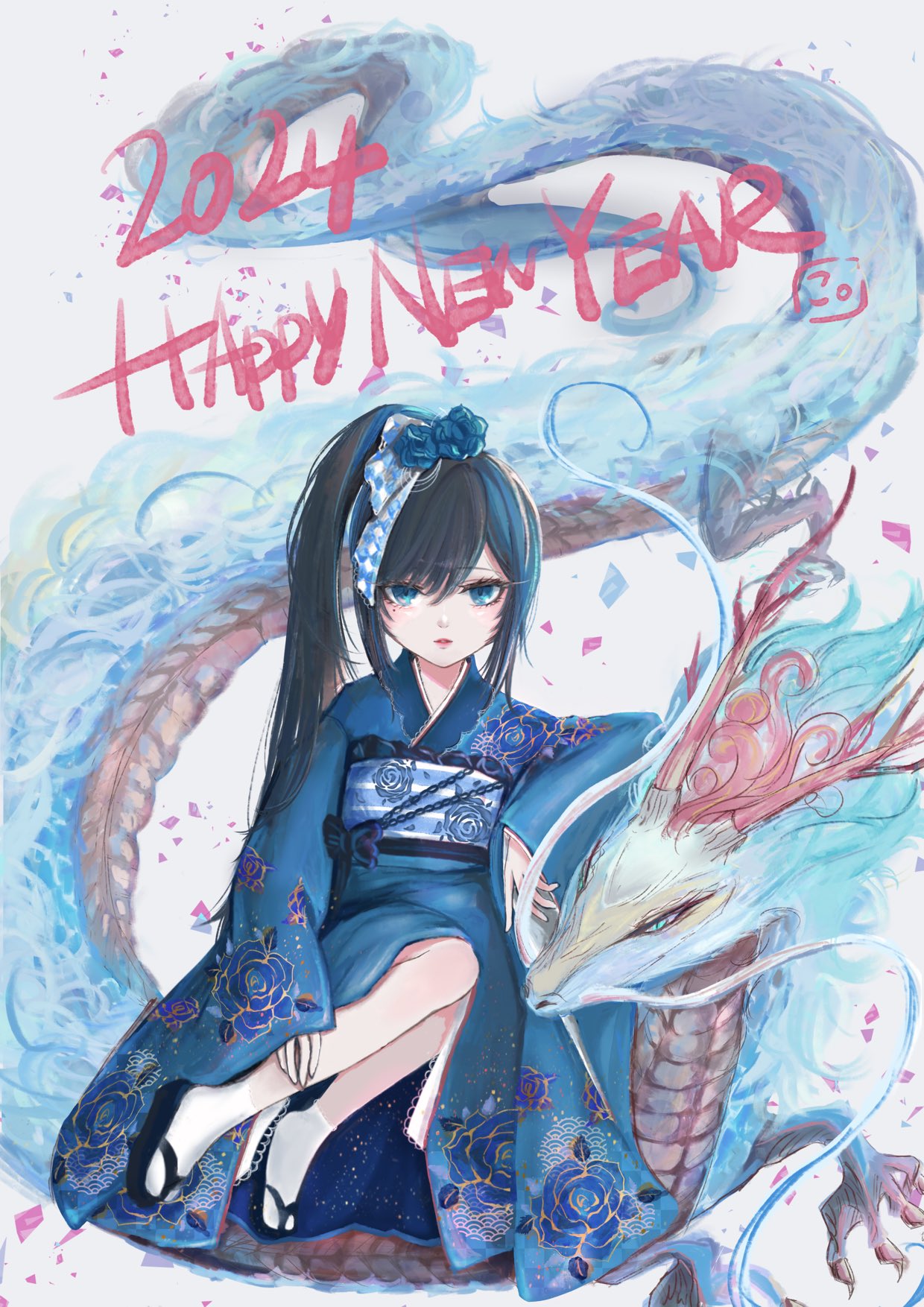 1girl 2024 ado_(utaite) alternate_hairstyle black_hair black_sandals blue_eyes blue_hair blue_kimono cco_(mizutama_ma) chando_(ado) chinese_zodiac cloud_nine_inc commentary dragon floral_print floral_print_kimono full_body furisode happy_new_year highres japanese_clothes kimono long_hair long_sleeves looking_at_viewer mole mole_under_eye multicolored_hair new_year obi parted_lips ponytail print_kimono sandals sash sidelocks sitting sleeves_past_wrists socks solo two-tone_hair utaite white_socks year_of_the_dragon