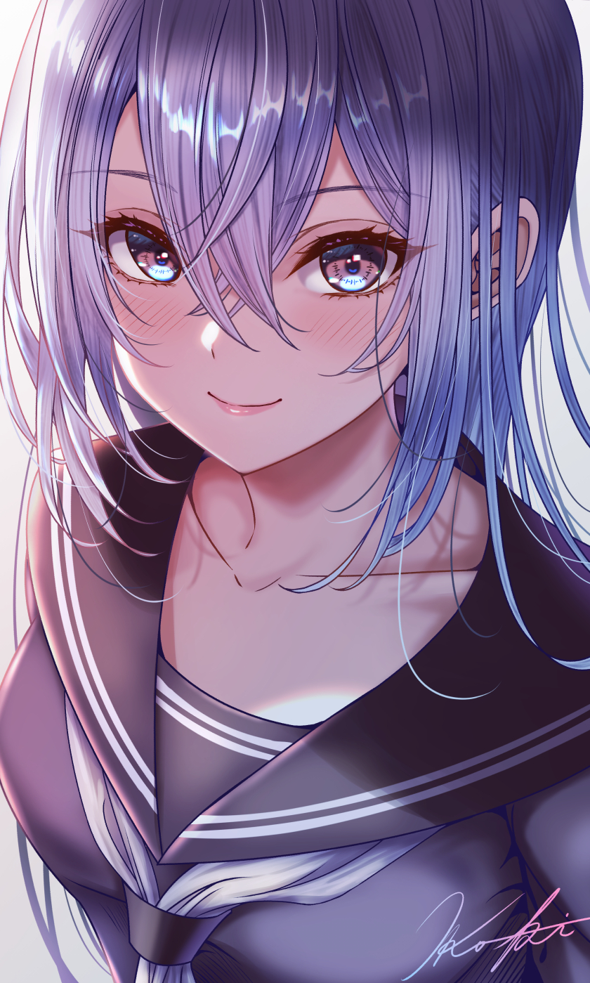 1girl black_shirt blue_hair blush collarbone grey_neckerchief hair_between_eyes highres idolmaster idolmaster_shiny_colors koya_(koya_x_00) looking_at_viewer neckerchief school_uniform serafuku shirt signature simple_background smile solo suzuki_hana upper_body white_background